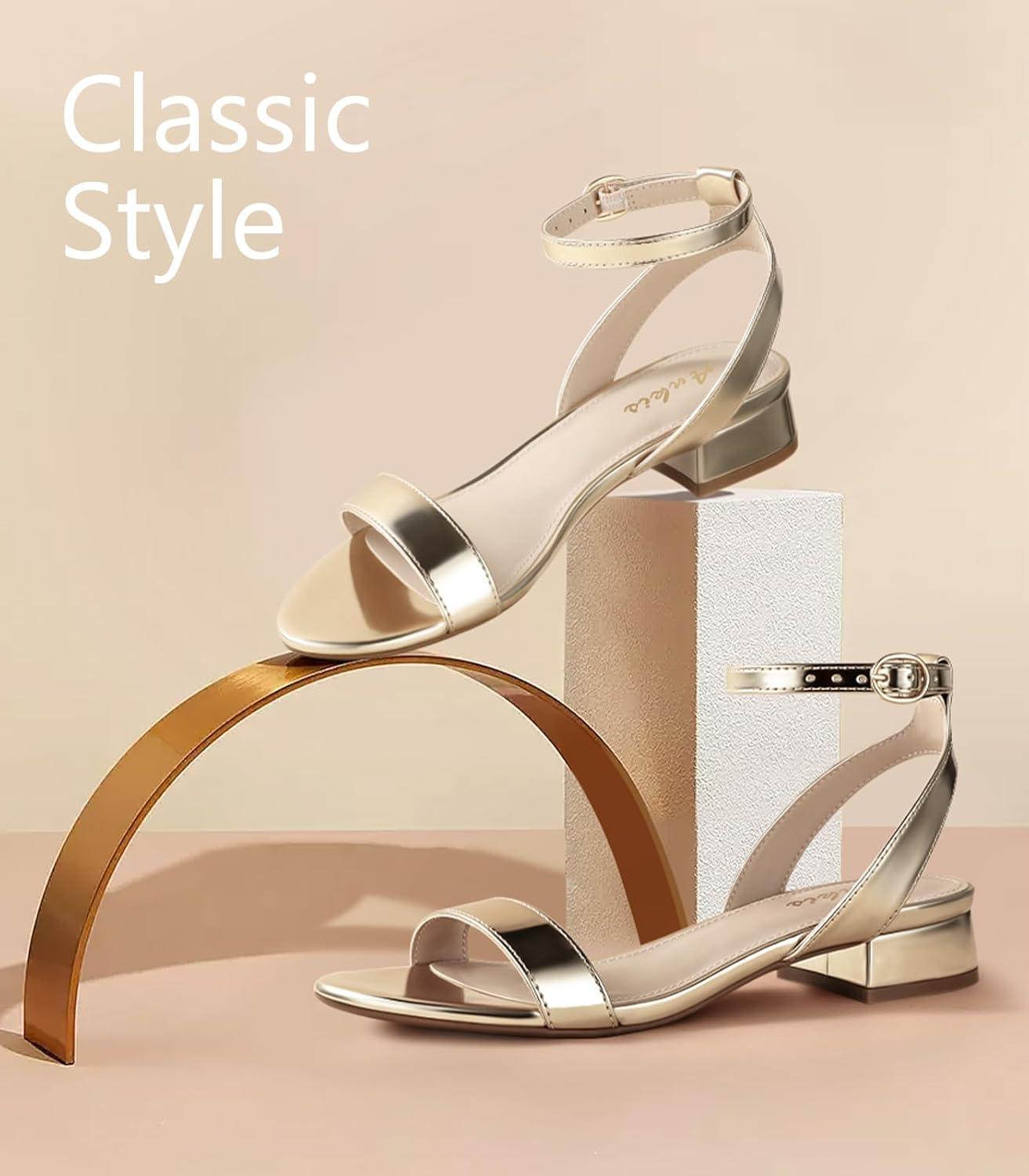 Ankis Black Nude White Red Women Sandals Comfortable Walking Strappy Open Toe Sandals for Women Dressy Summer 1 Inch Low block Heel Flat Adjustable Ankle Strap Wide Available Shoes 2025(Gold Pu)