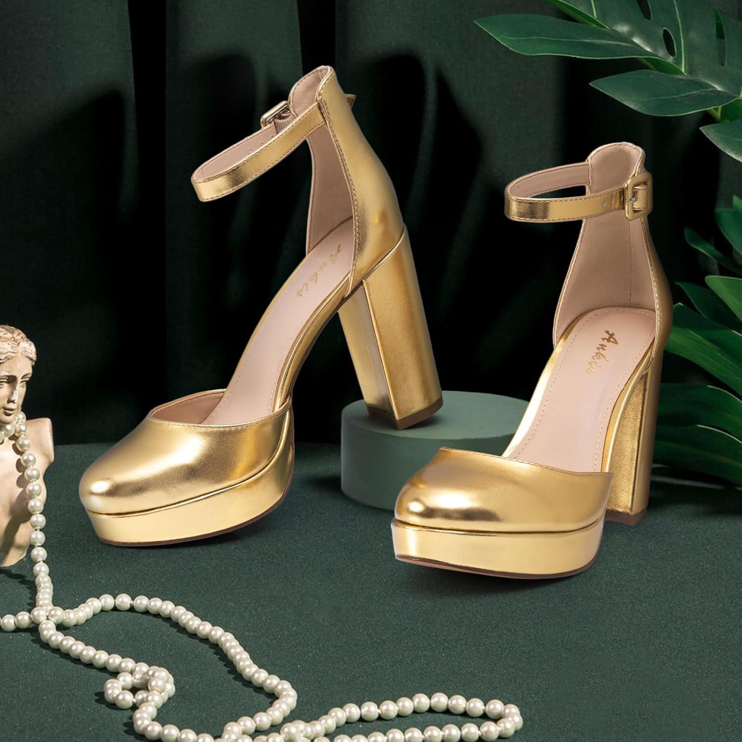 imageAnkis Black Platform Closed Toe Heels for Women Womens Heels Closed Round Toe Chunky Block Pumps Shoes 4 InchGold