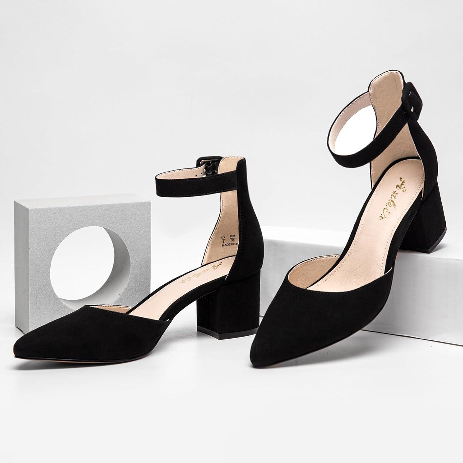 Ankis Closed Toe Heels for Women -Black Nude Gold Silver Pointed Toe Heels Low Block Chunky Women Pumps with Ankle Strap -2.25 Inch(Black Suede)