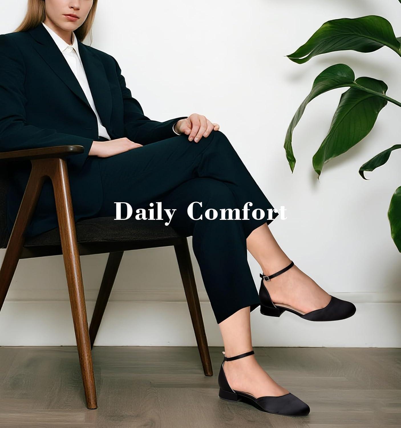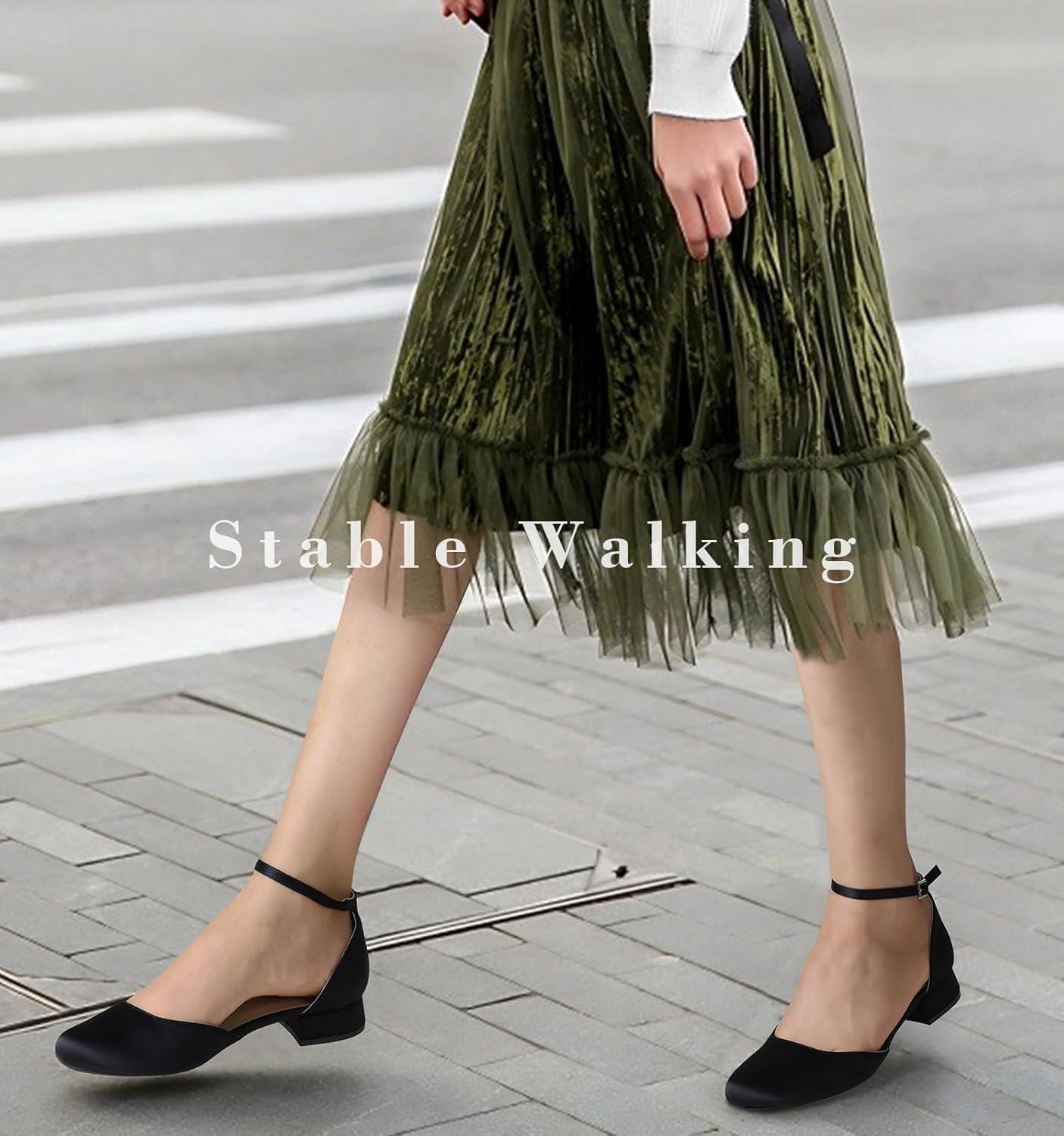 Ankis Closed Toe Heels for Women, Black Nude White Gold Silver 1 Inch Women’s Flats Low Block Heel Women Dress Shoes Womens Pumps Work Shoes with Ankle Strap for Spring Fall(Black Satin)