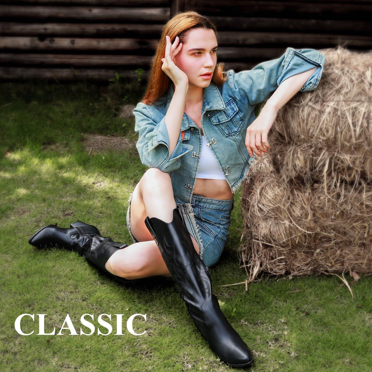 Ankis Cowboy Boots for Women Wide Calf Cowgirl Boots Comfortable Knee High Chunky Heel Embroidered Western White Black Pull On Tall Boot Retro Poitned Toe Fall Winter Shoes(Black)