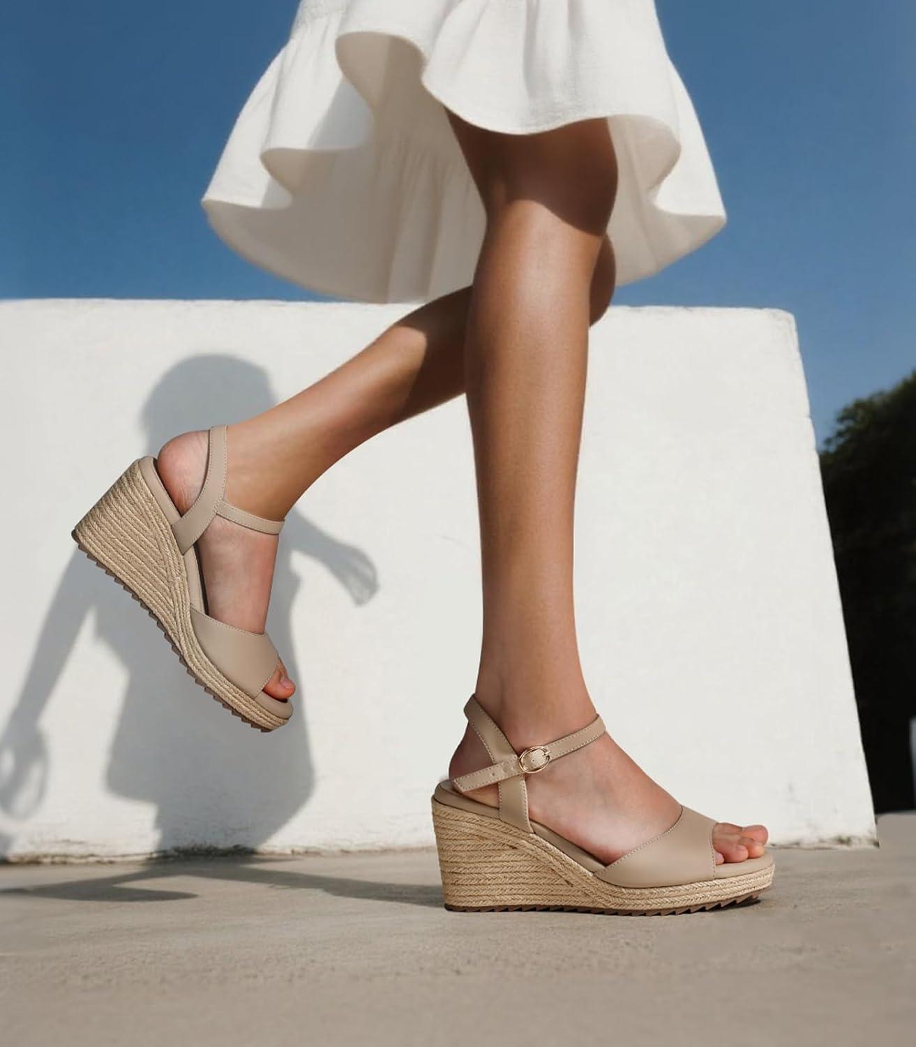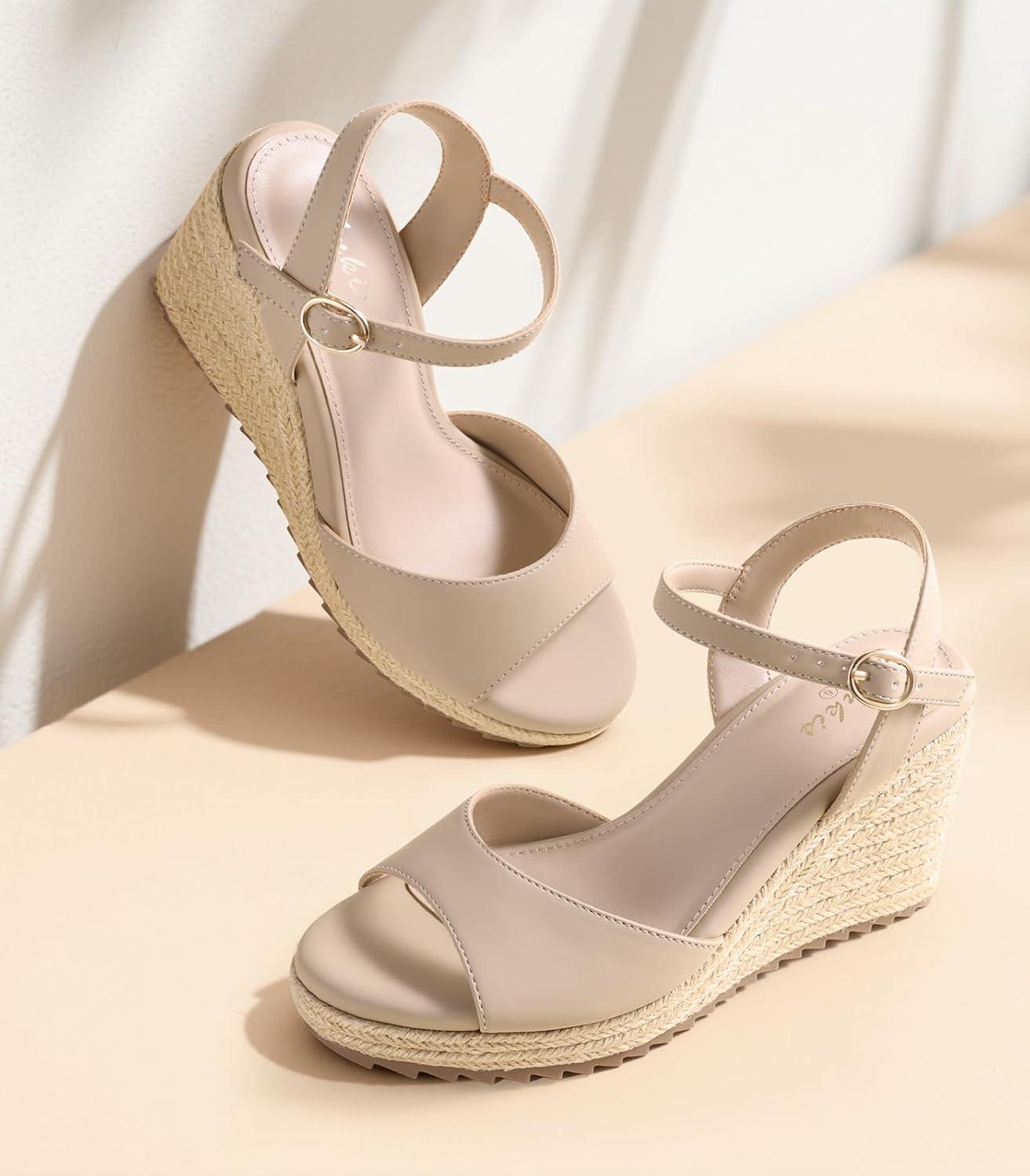 Ankis Espadrilles Wedges Sandals for Women Wedge Platform Sandals Heels Peep Open Toe Comfortable Ankle Strap Buckle Summer Wedge Heels(Nude Nubuck)