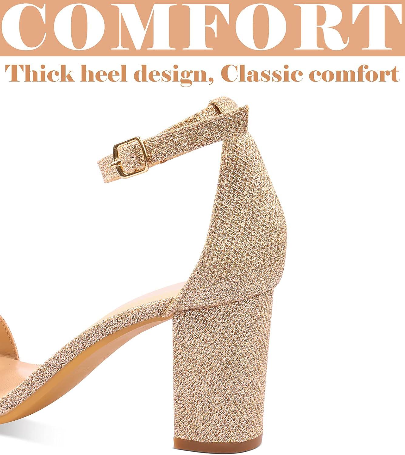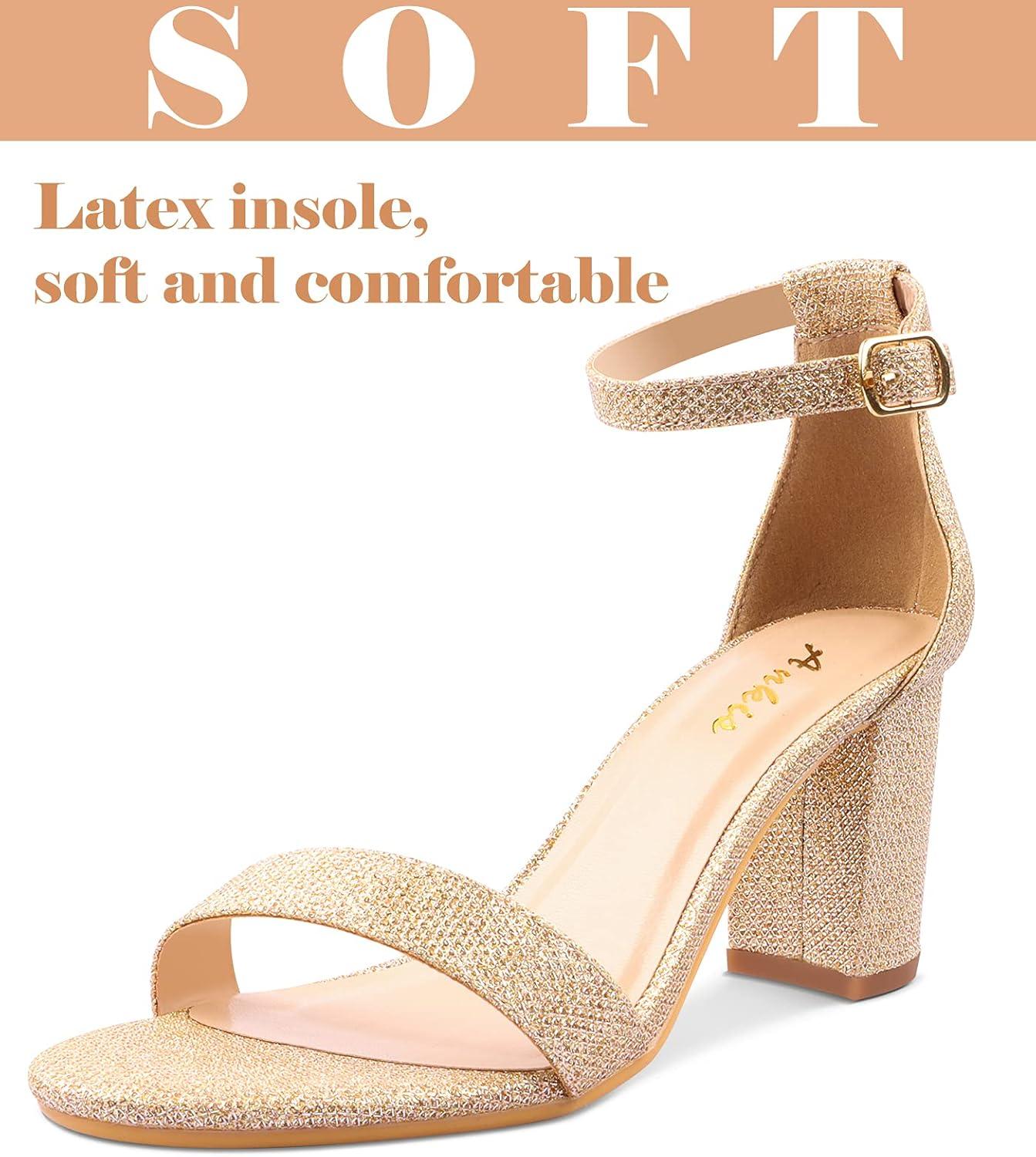 Ankis Heels for Women Open Toe Ankle Strap Chunky Heel Sandals 2.75 Inch(Gold/Glitter)