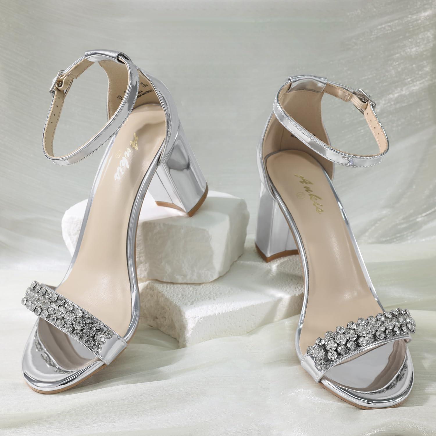 Ankis Heels for Women Open Toe Ankle Strap Chunky Heel Sandals 2.75 Inch(Silver Rhinestone)