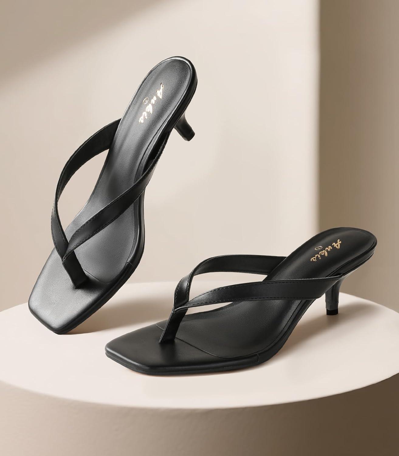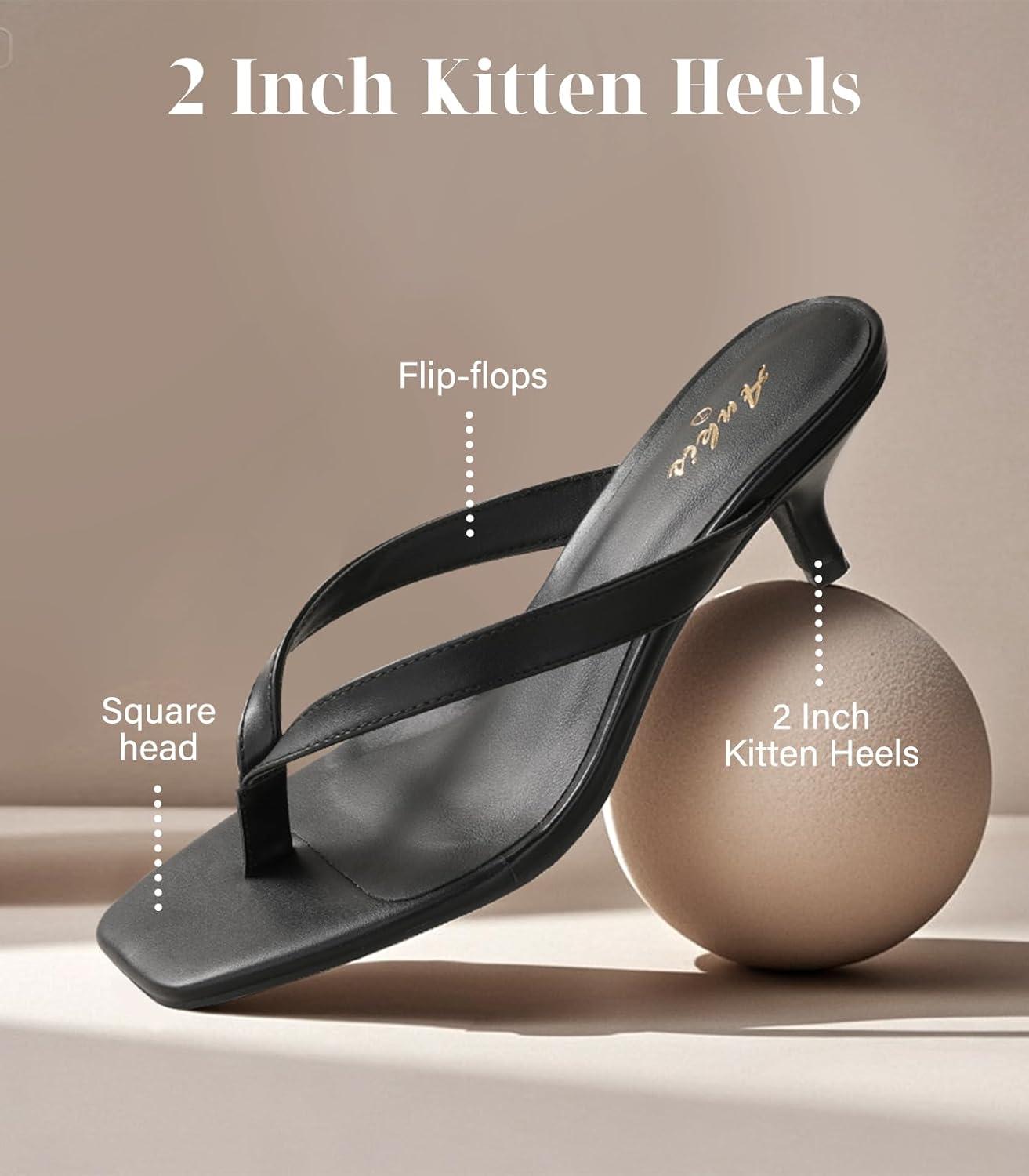 imageAnkis Kitten Heels for Women Black Brown Square Toe Flip Flop Heels 2 Inch Low Heeled Thong Summer SandalsBlack Pu