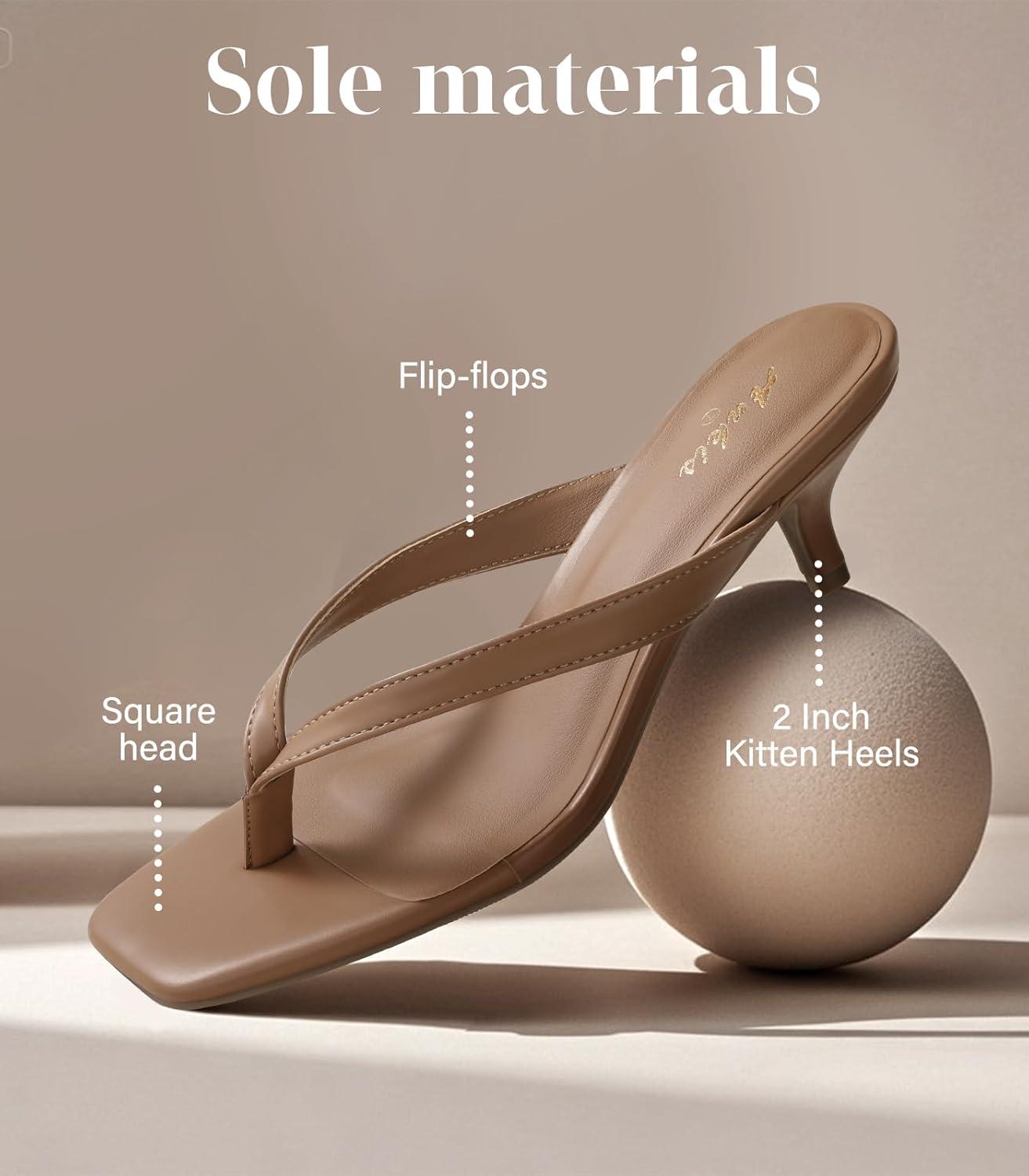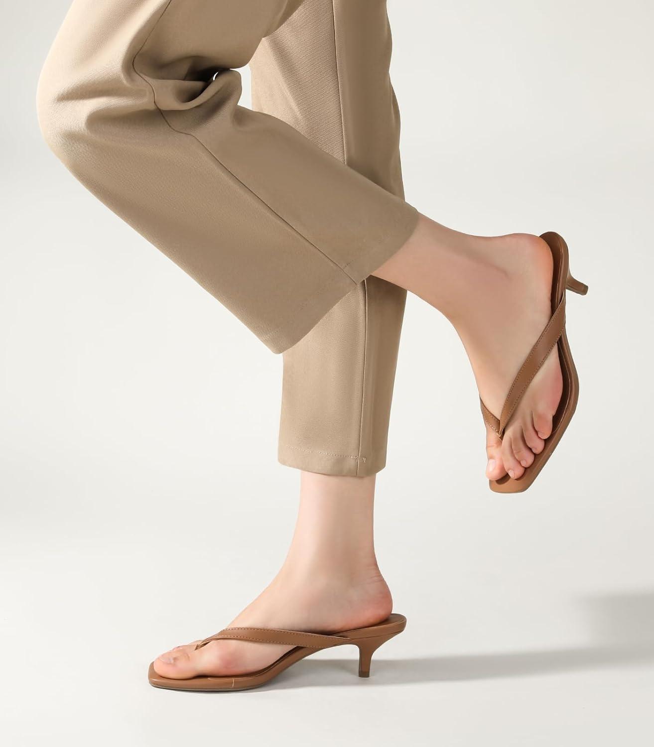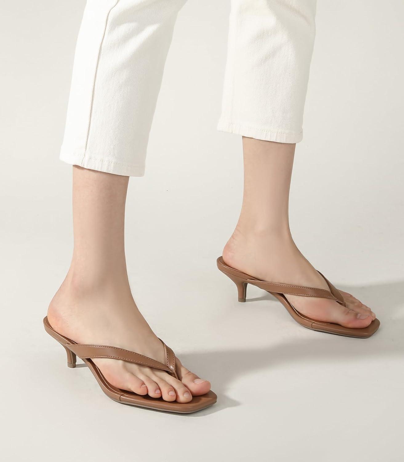 imageAnkis Kitten Heels for Women Black Brown Square Toe Flip Flop Heels 2 Inch Low Heeled Thong Summer SandalsBrown Pu