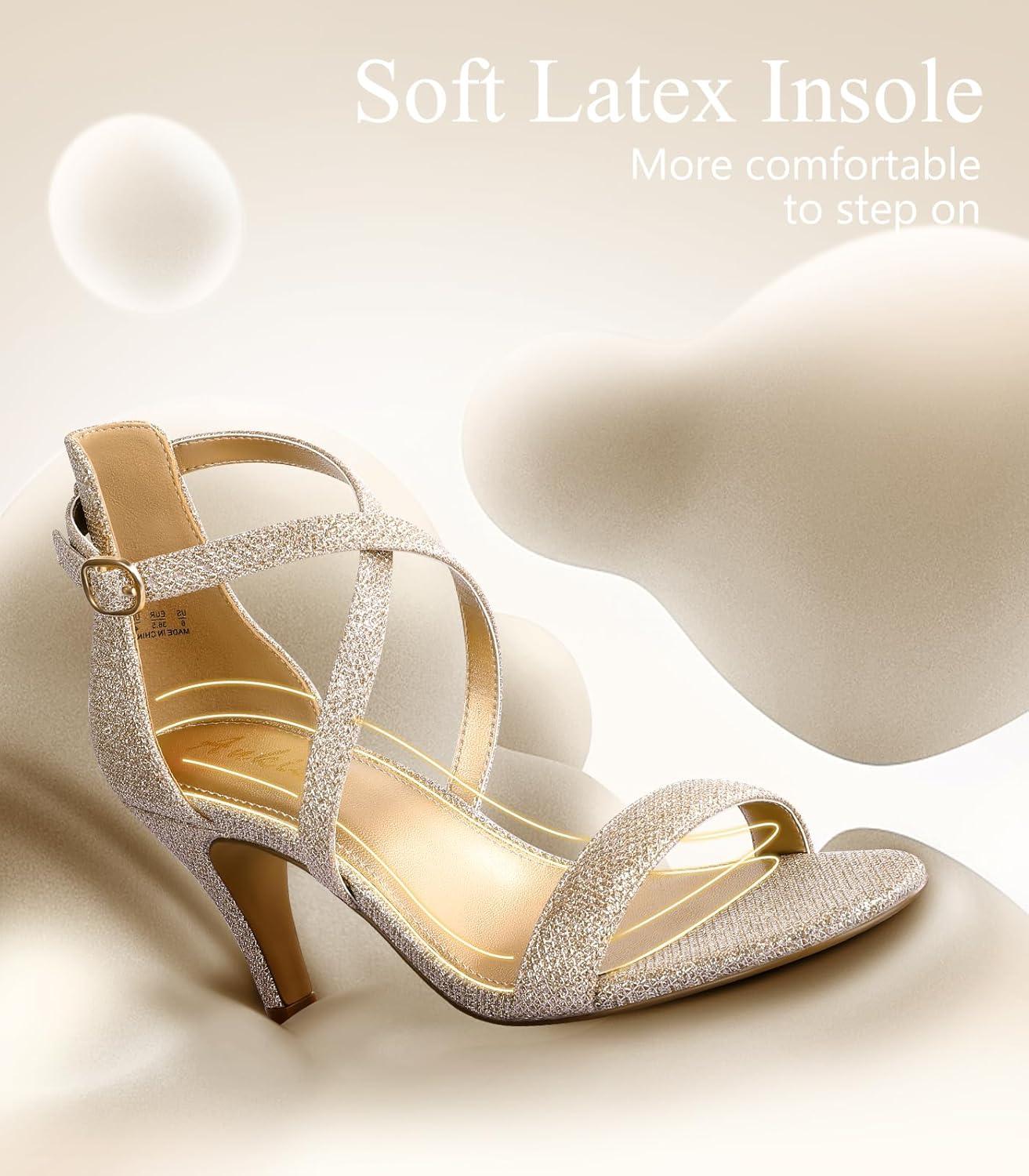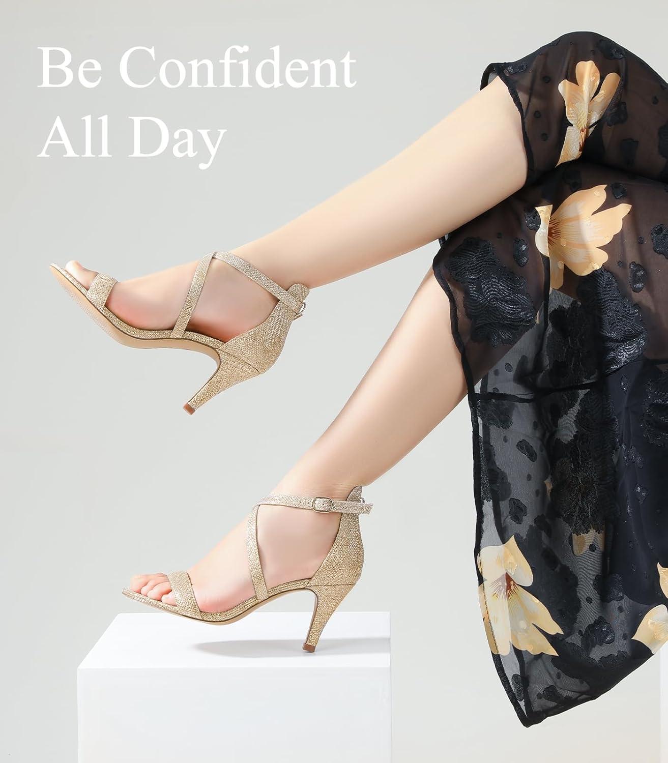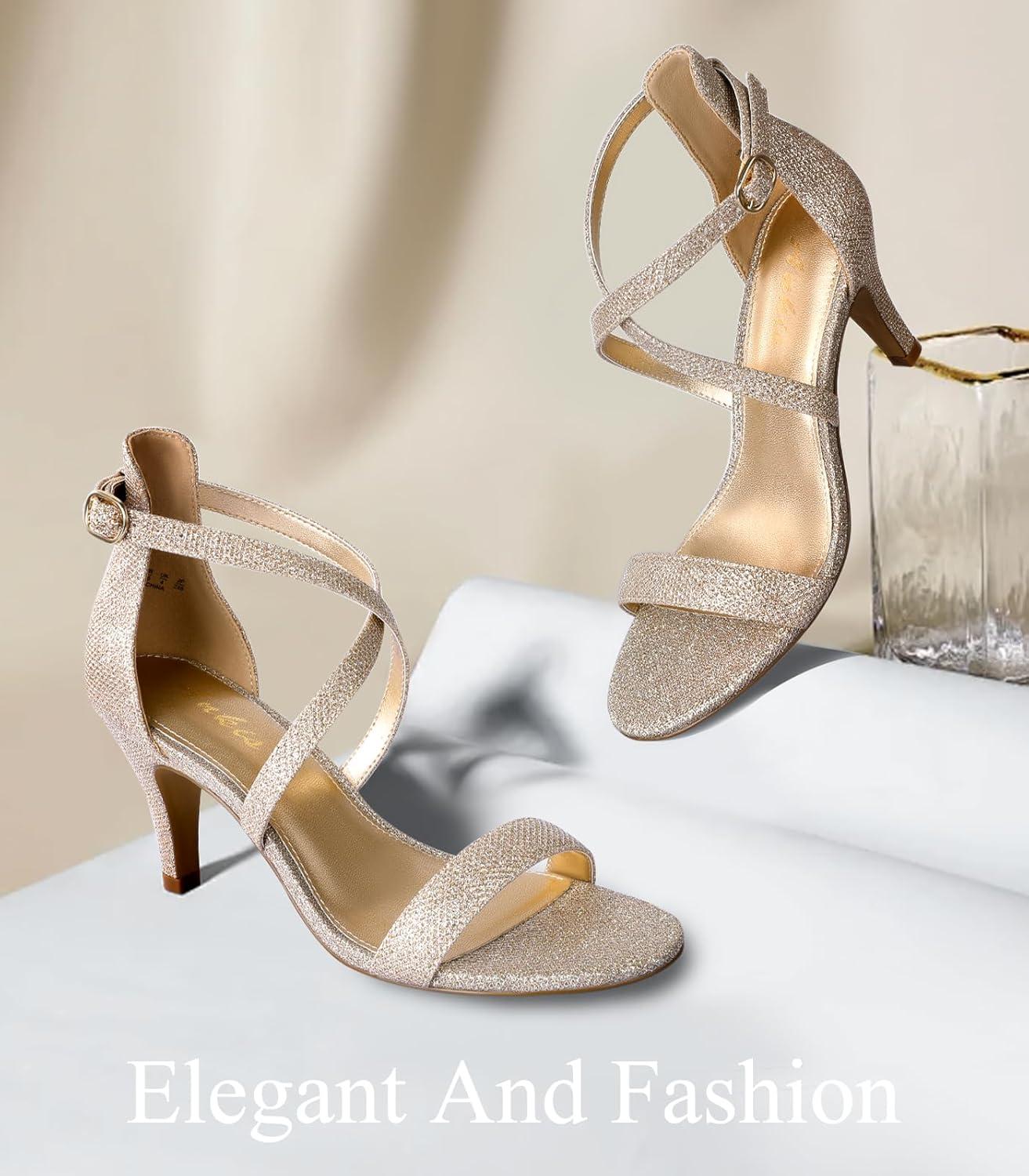 Ankis Nude Gold Black Heels Strappy Heels for Women 3 Inch Stiletto Open Toe Sandals for Wedding Evening Party Homecoming(Silver Fabric)