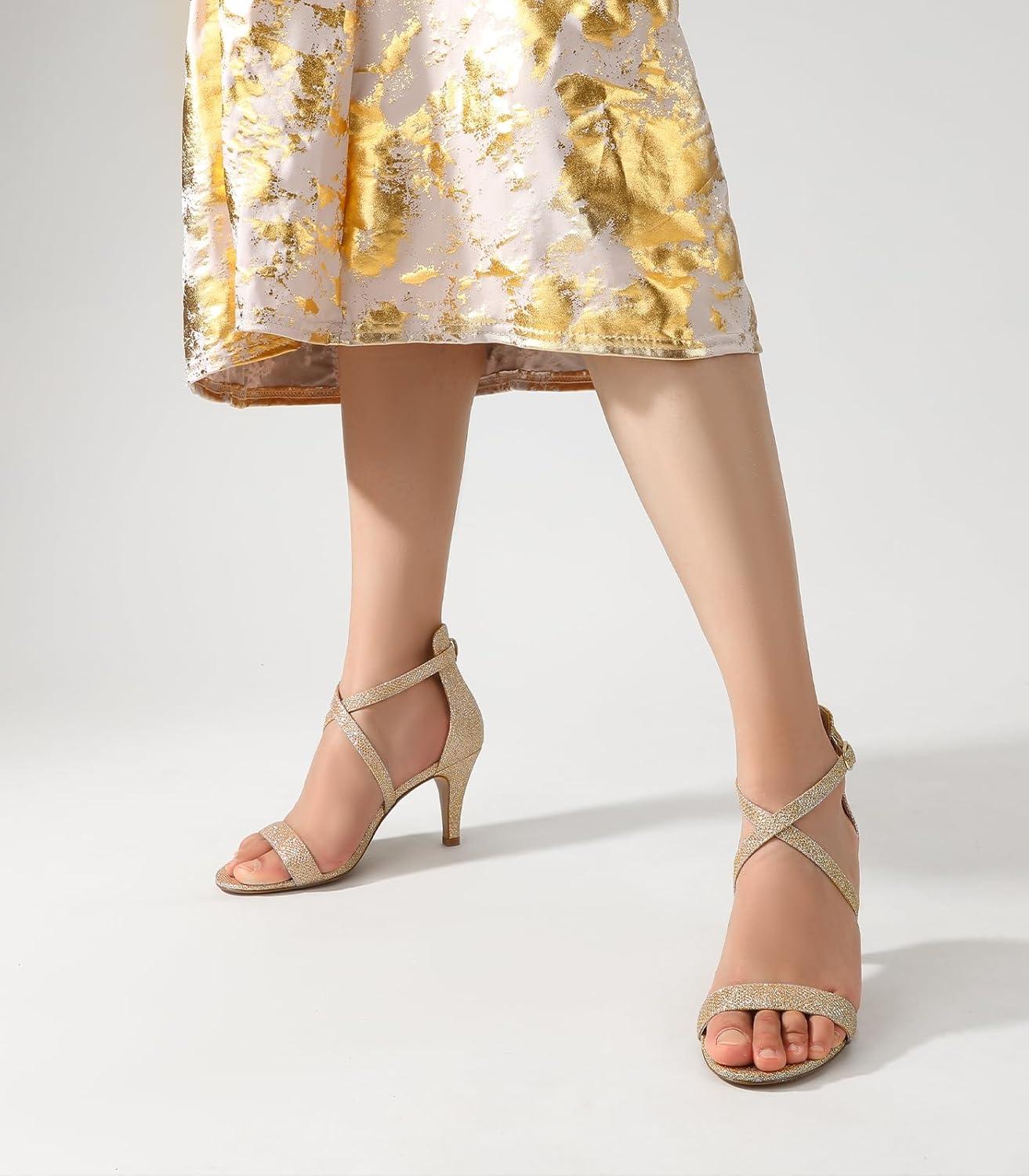 Ankis Nude Gold Black Heels Strappy Heels for Women 3 Inch Stiletto Open Toe Sandals for Wedding Evening Party Homecoming(Gold Fabric)
