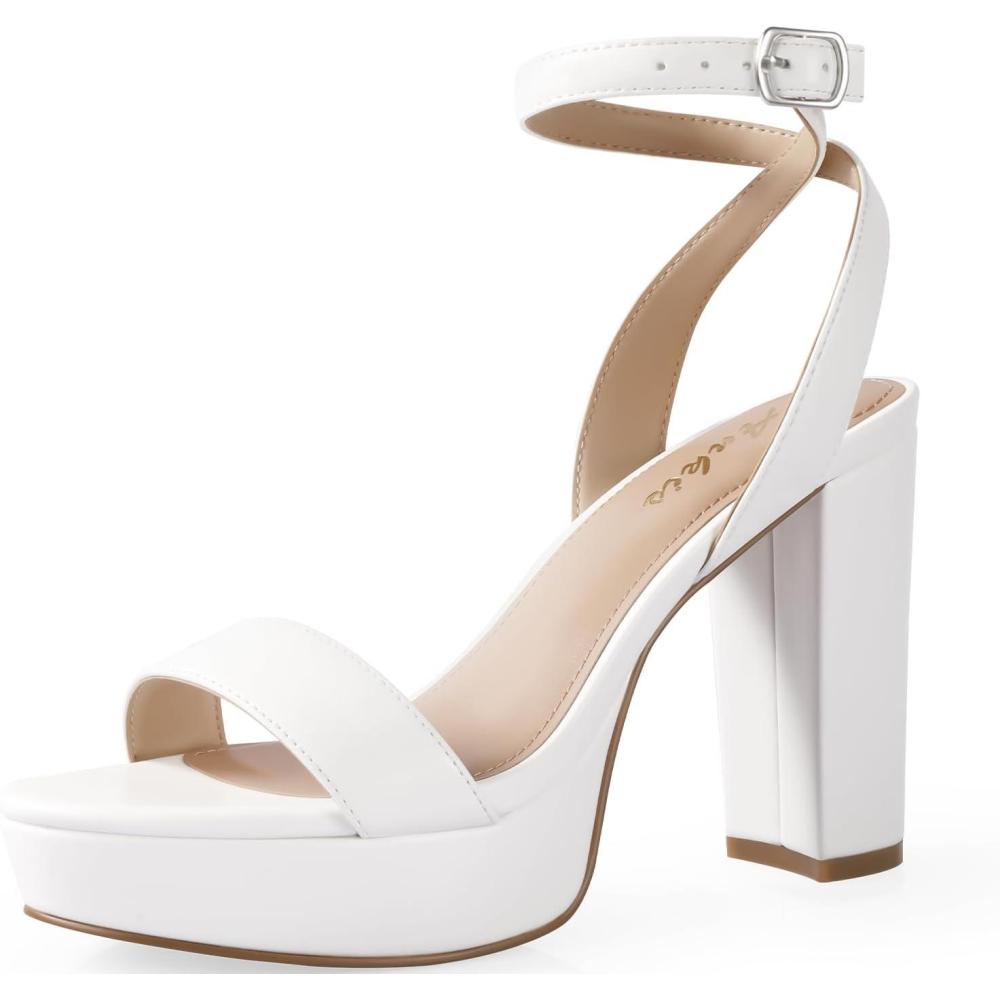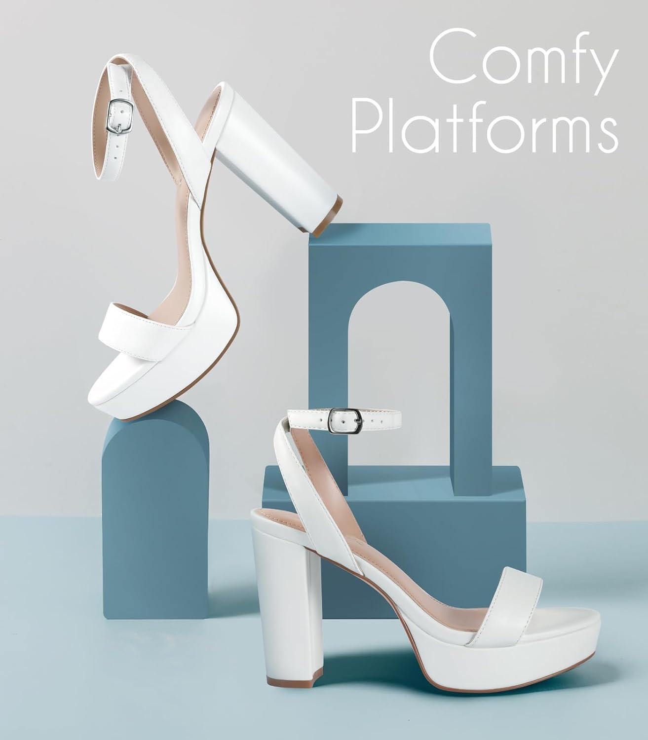 Ankis Platform Heels for Women 4 Inches Chunky Heels Sandals for Women Comfy Open Toe Block Heeled Sandals Nude White Silver Gold Black Ankle Strappy Heels(C- White Pu)