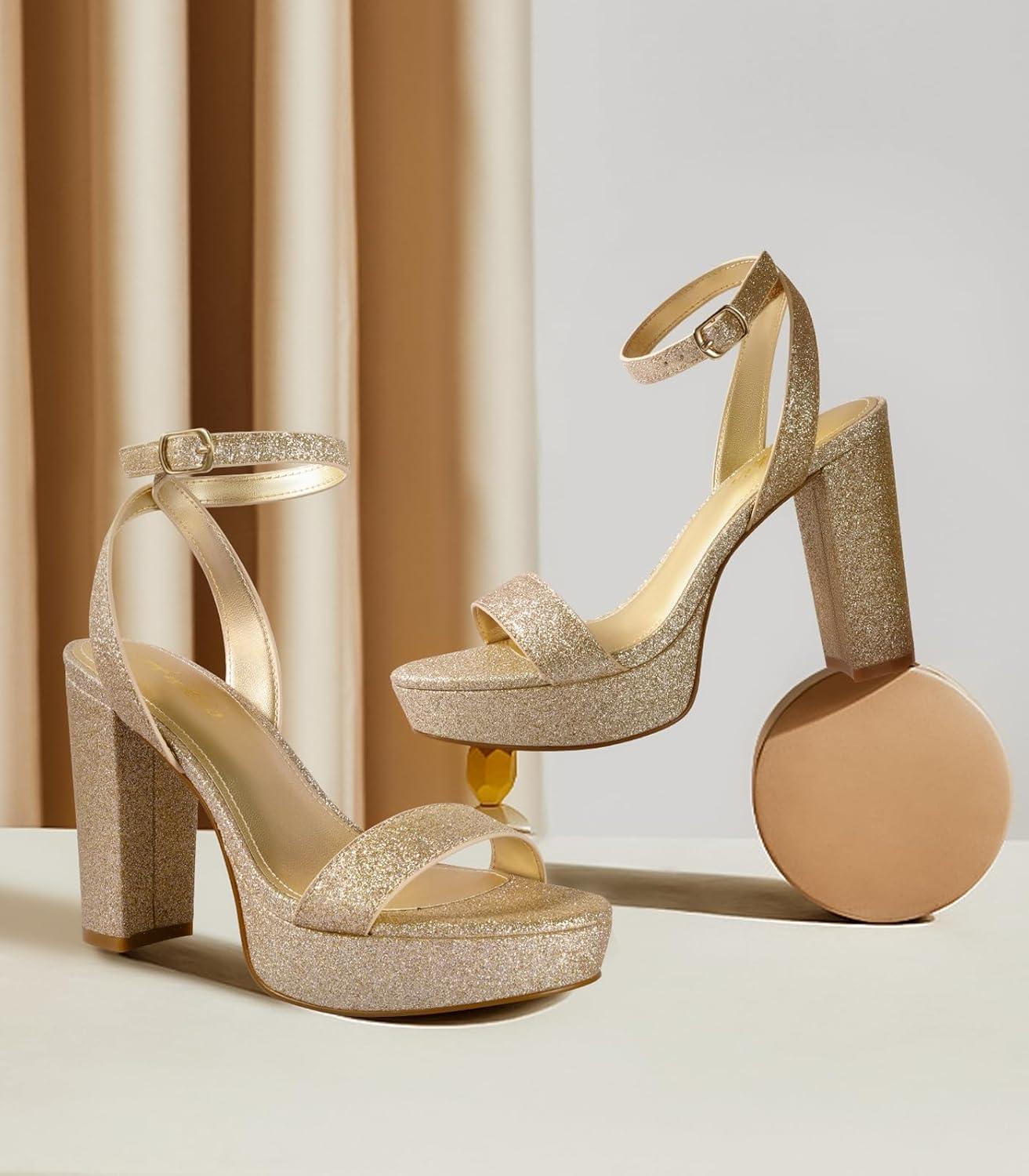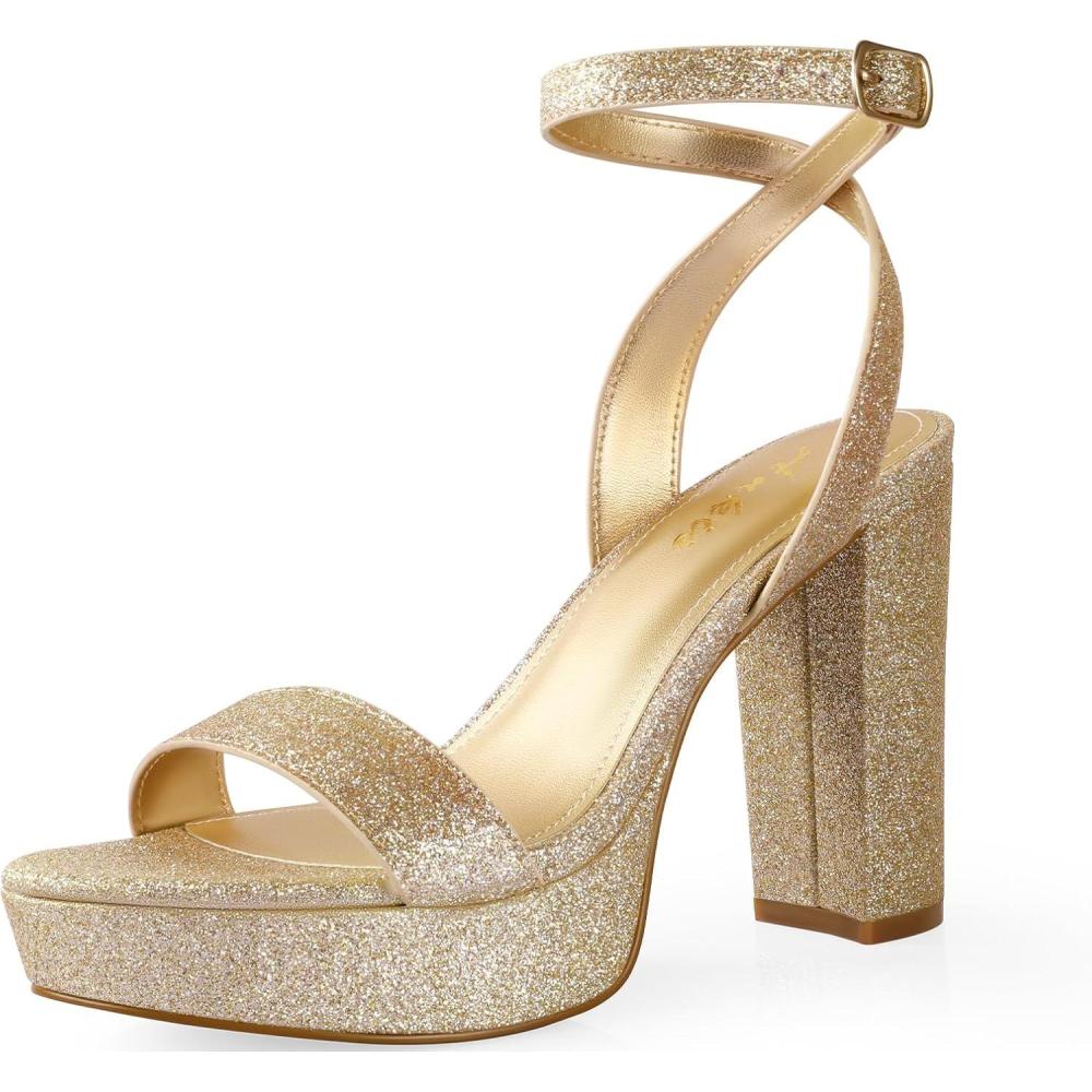 imageAnkis Platform Heels for Women 4 Inches Chunky Heels Sandals for Women Comfy Open Toe Block Heeled Sandals Nude White Silver Gold Black Ankle Strappy HeelsE Gold Shinny