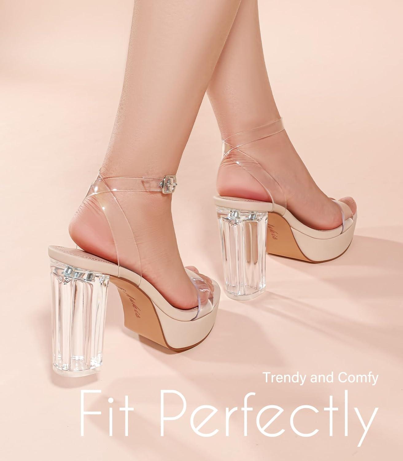 Ankis Platform Heels for Women 4 Inches Chunky Heels Sandals for Women Comfy Open Toe Block Heeled Sandals Nude White Silver Gold Black Ankle Strappy Heels(F- Crystal Clear)