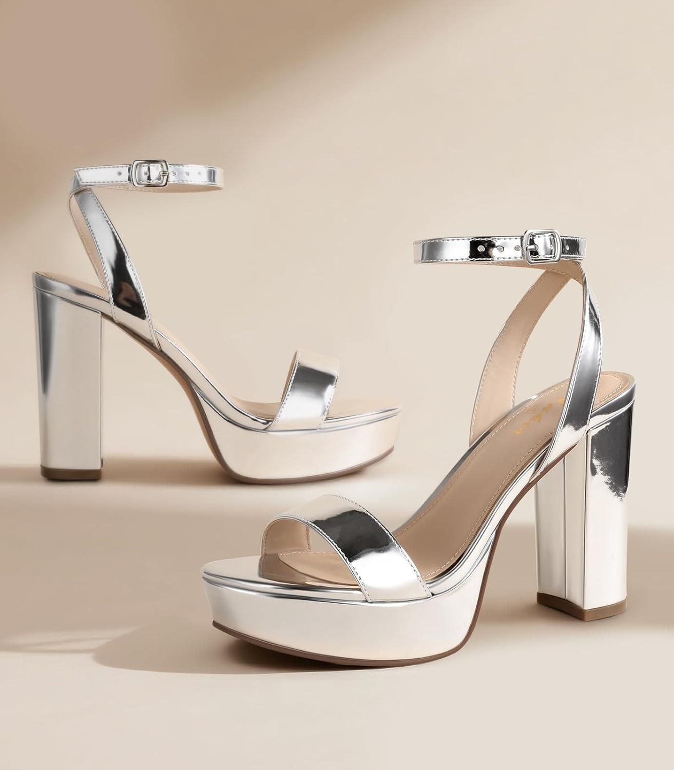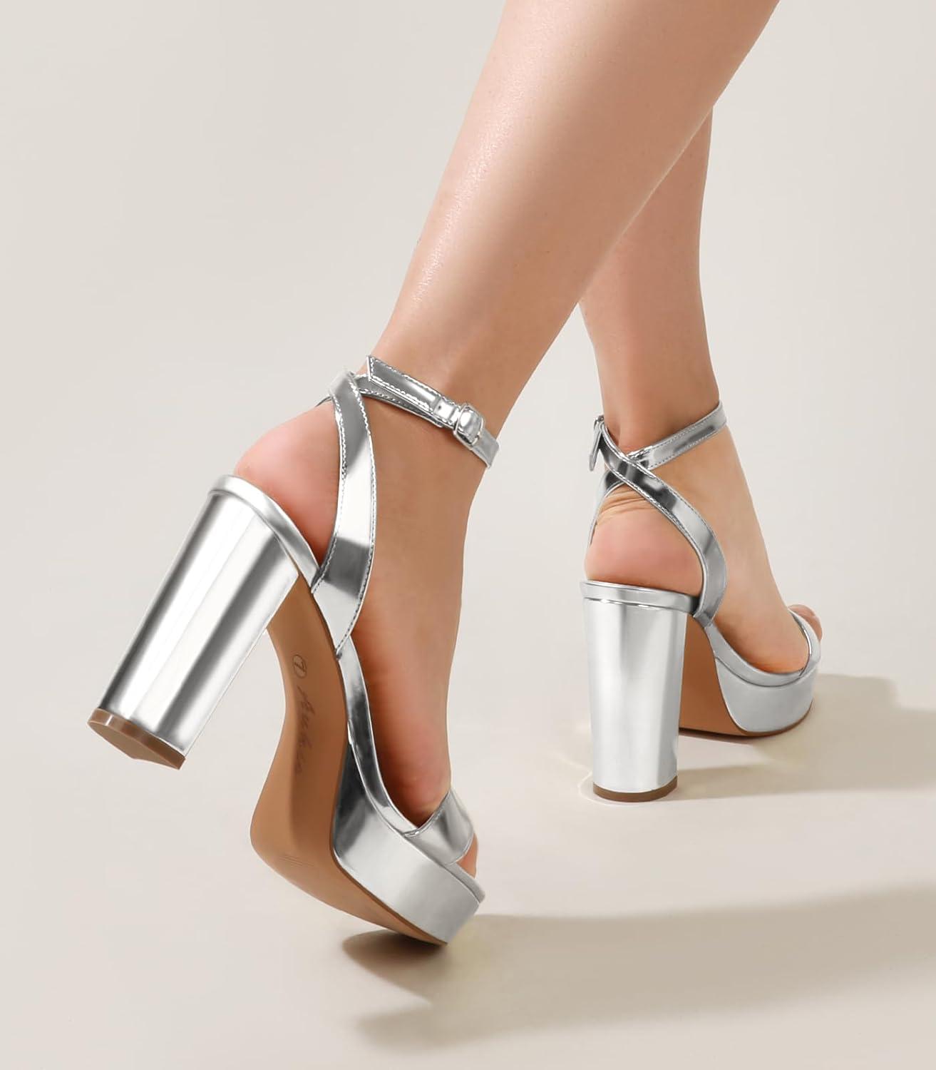 Ankis Platform Heels for Women 4 Inches Chunky Heels Sandals for Women Comfy Open Toe Block Heeled Sandals Nude White Silver Gold Black Ankle Strappy Heels(Silver Pu)