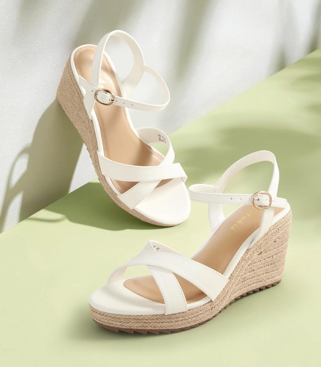 Ankis Wedge Sandals for Women, Espadrille Womens Wedge Sandals Comfortable Open Toe Cross Band Ankle Strap High Heel Wedges for Women Dressy Summer -3.4Inch(White Pu)
