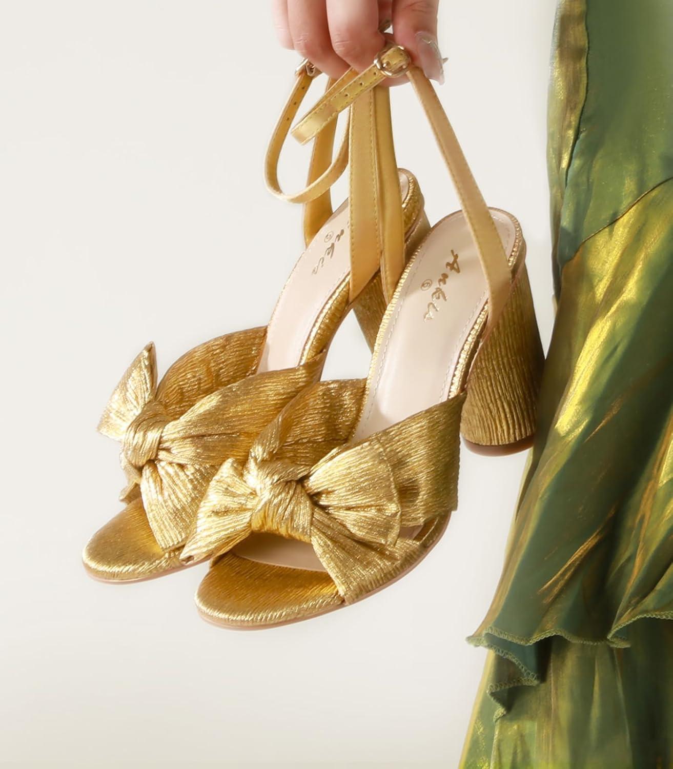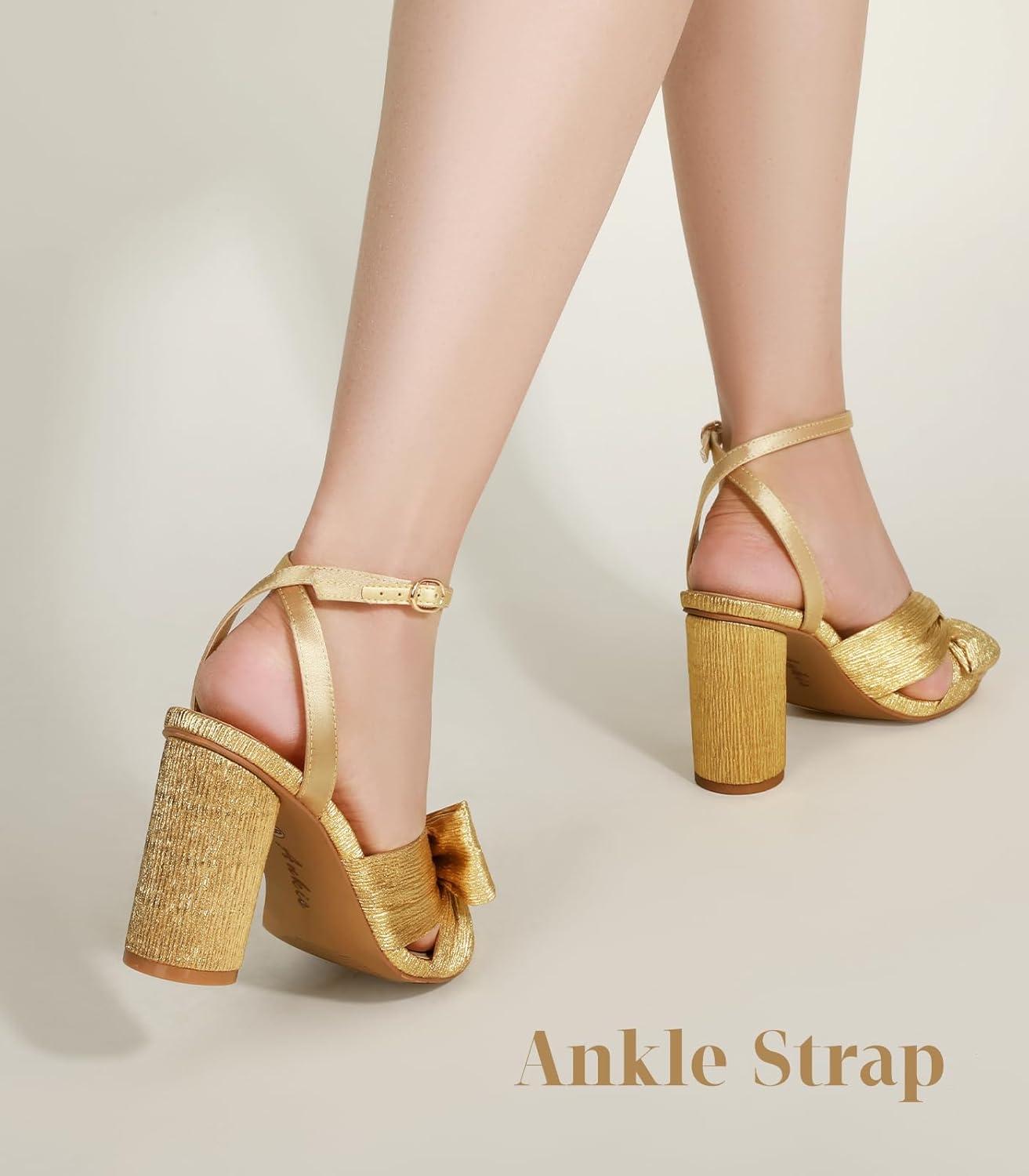 imageAnkis White Gold Bow Heel Chunky Wedding Shoes for Bride 315 Inch High Heel Open Toe Ankle Buckle Strap Dressy Pleated Kont Women Shoe Party Graduation Event SummerGold