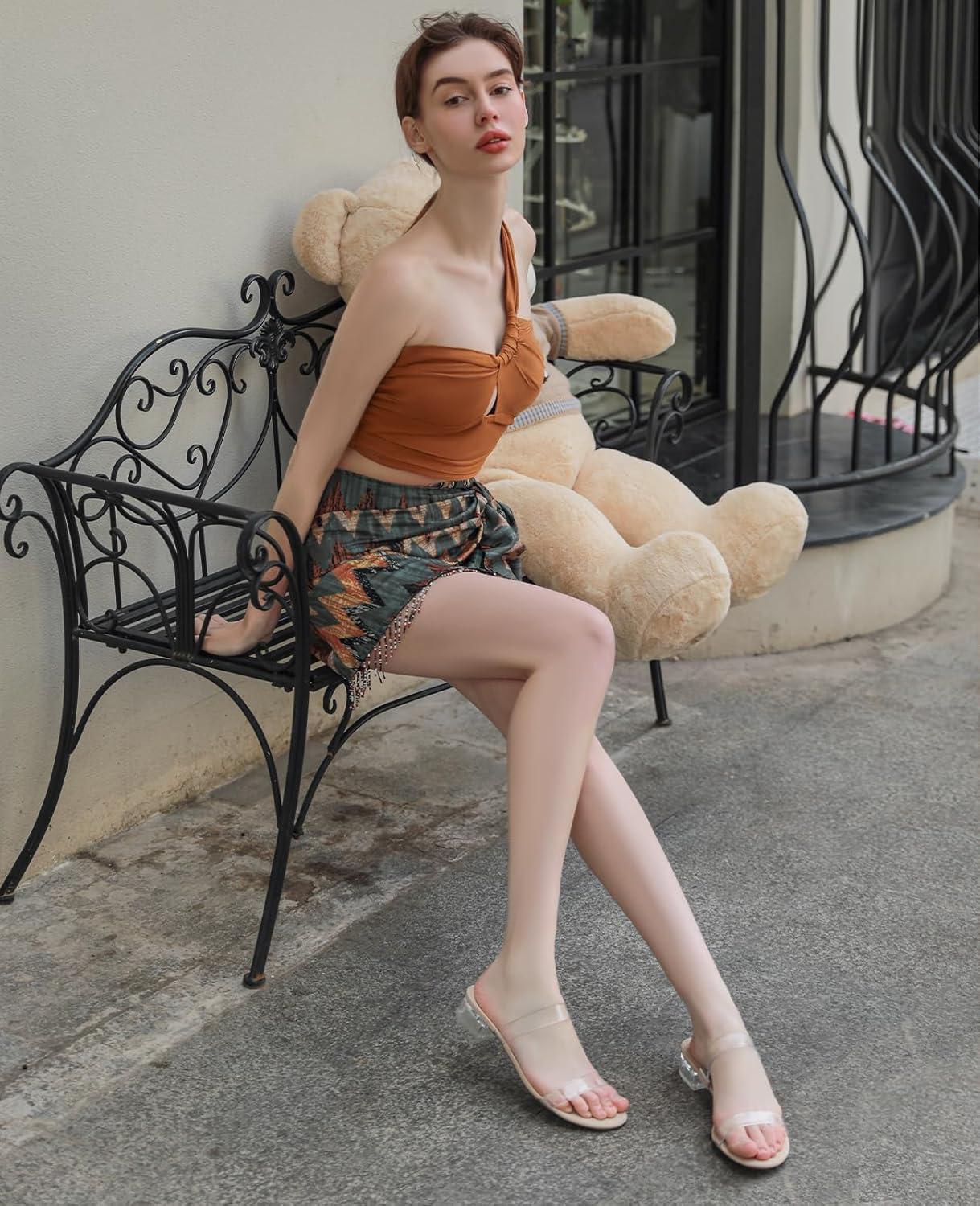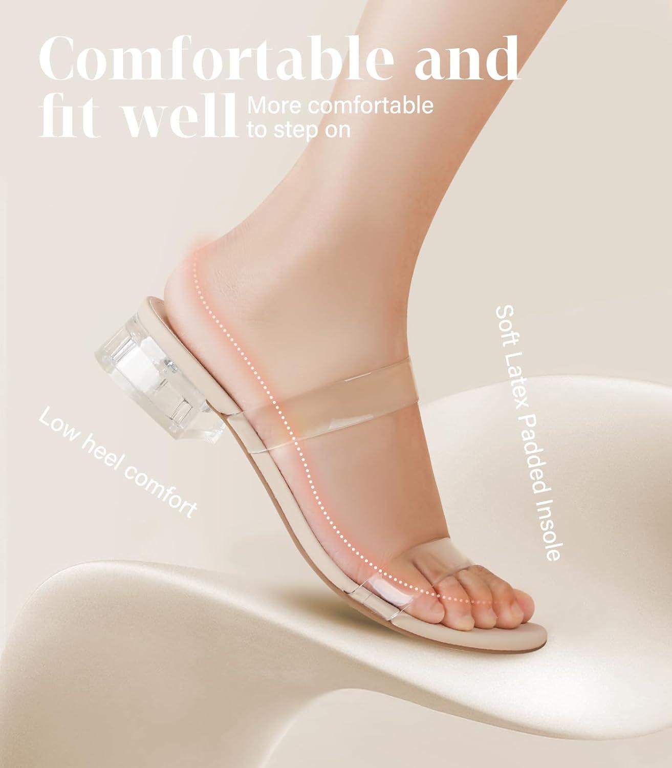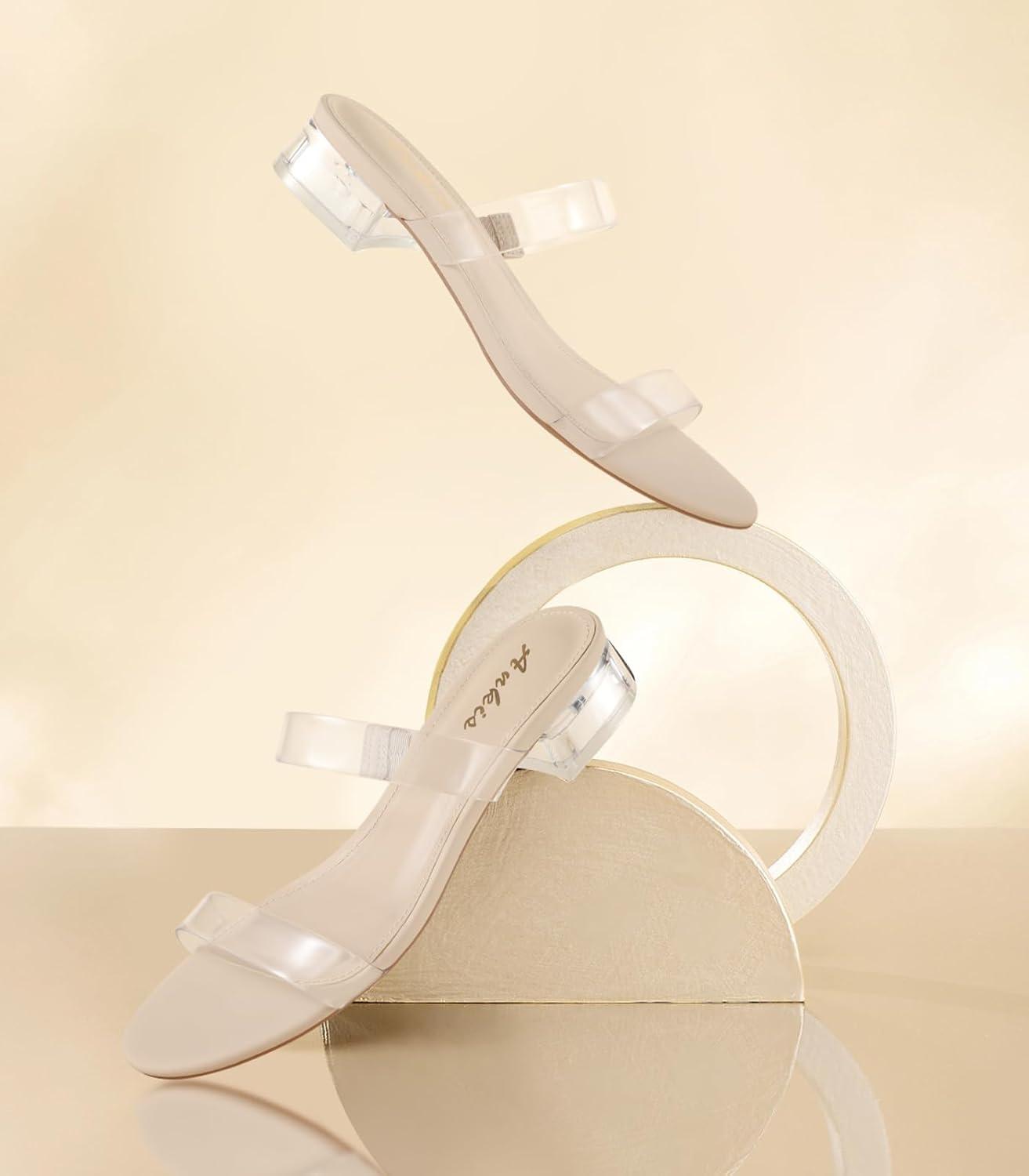 Ankis Women Black White Nude Clear Heels Sandals - 1 Inch Heels for Women Low Chunky Block Heels Comfortable Two Strap Open Toe Flat Sandals Shoe for Dressy Wedding Summer(Nude Clear)