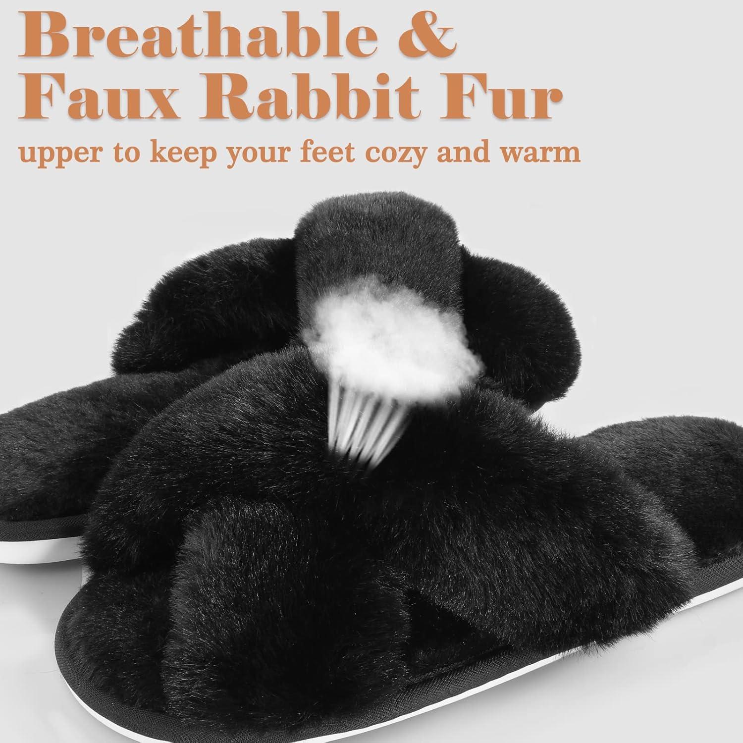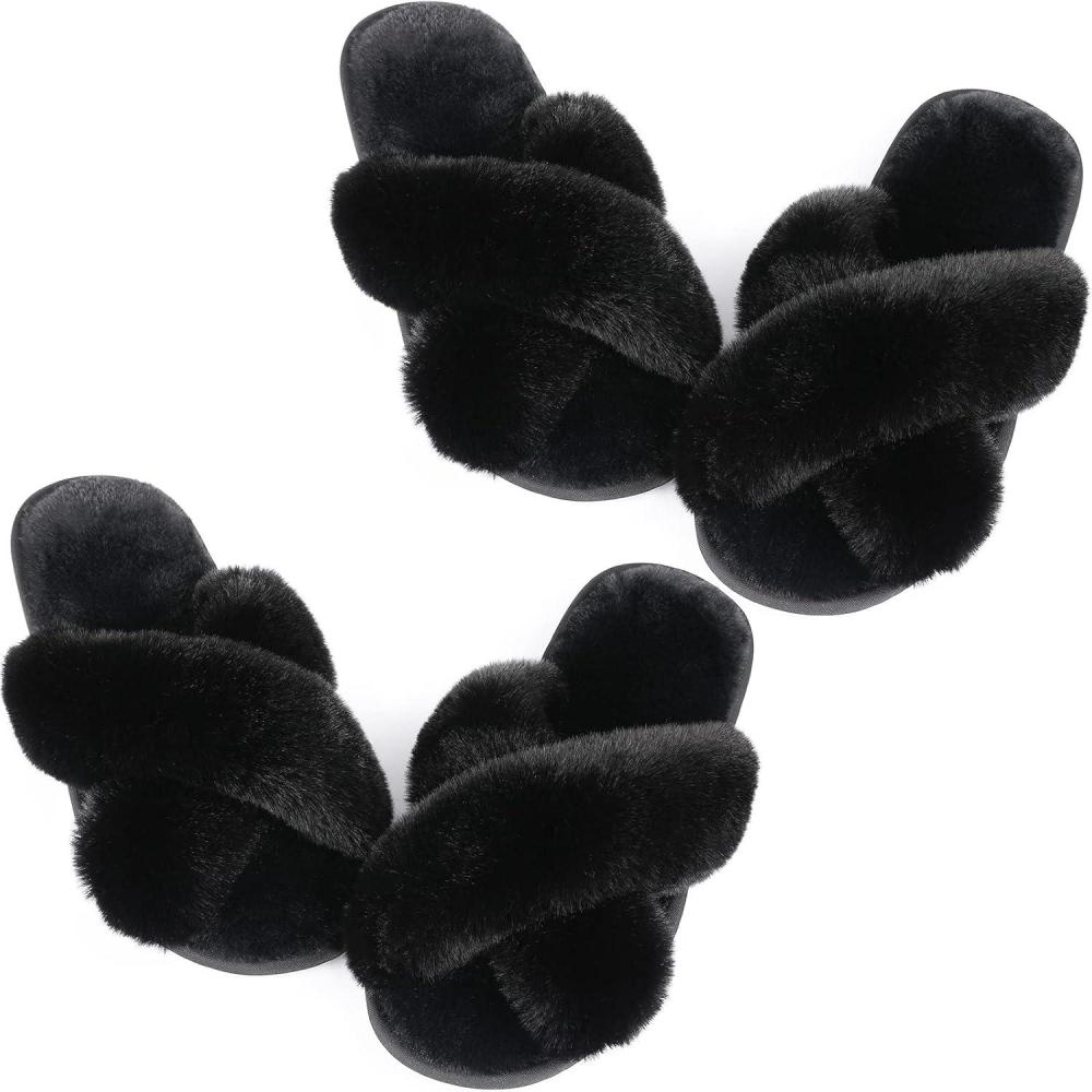 Ankis Women's Fuzzy, Cozy Soft Slippers - 2 Pairs Cross Band, Open Toe, Non-slip, Indoor/Outdoor Slippers(Black)