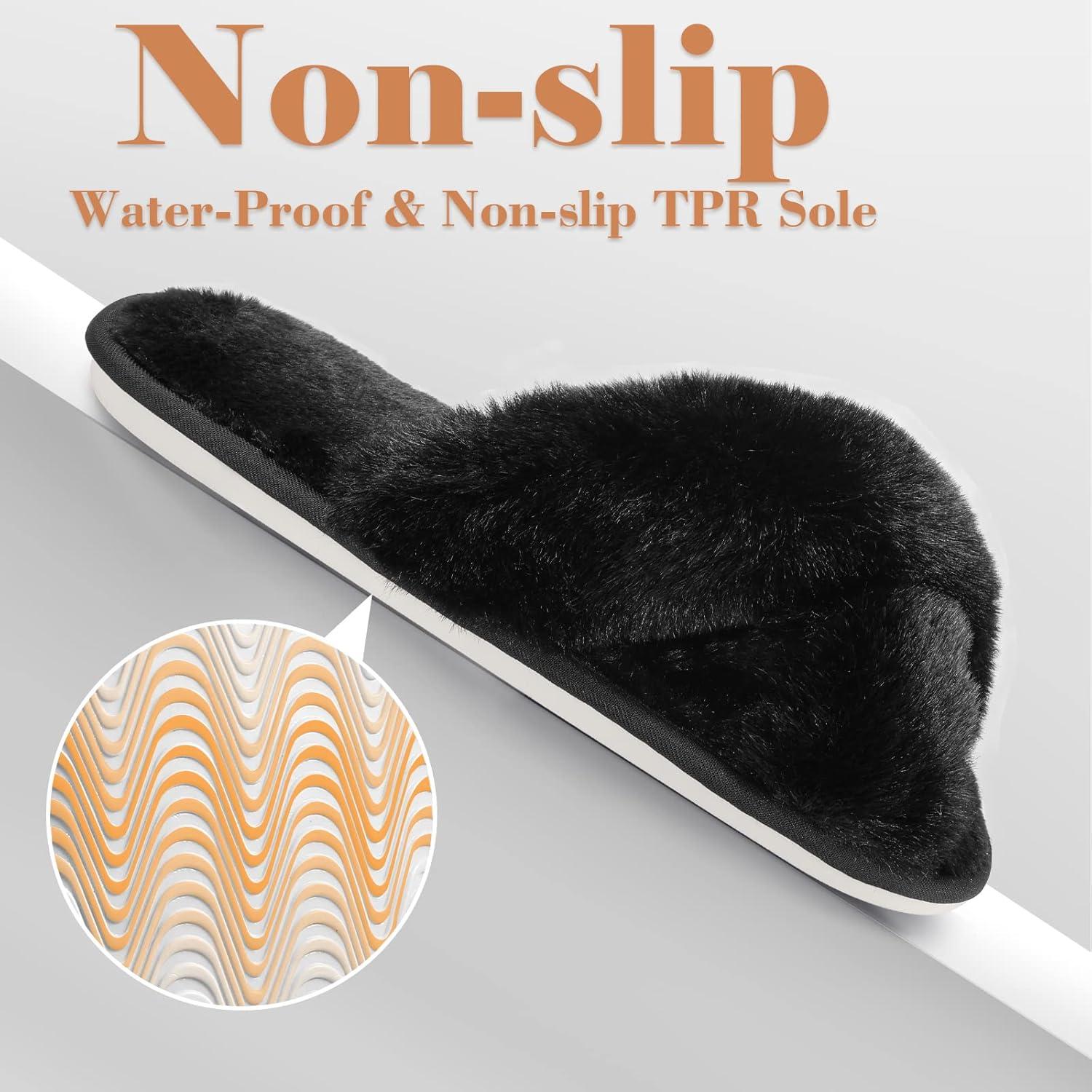 Ankis Women’s Fuzzy, Cozy Soft Slippers – 2 Pairs Cross Band, Open Toe, Non-slip, Indoor/Outdoor Slippers(Black)