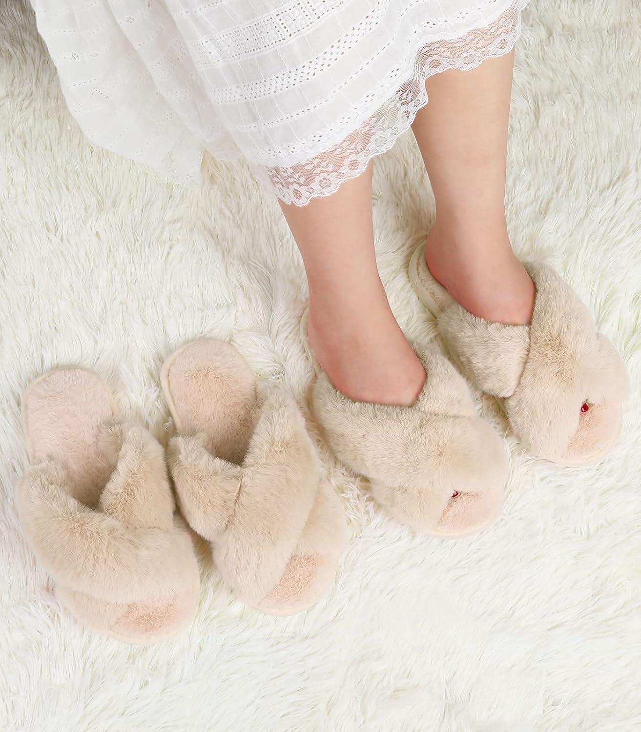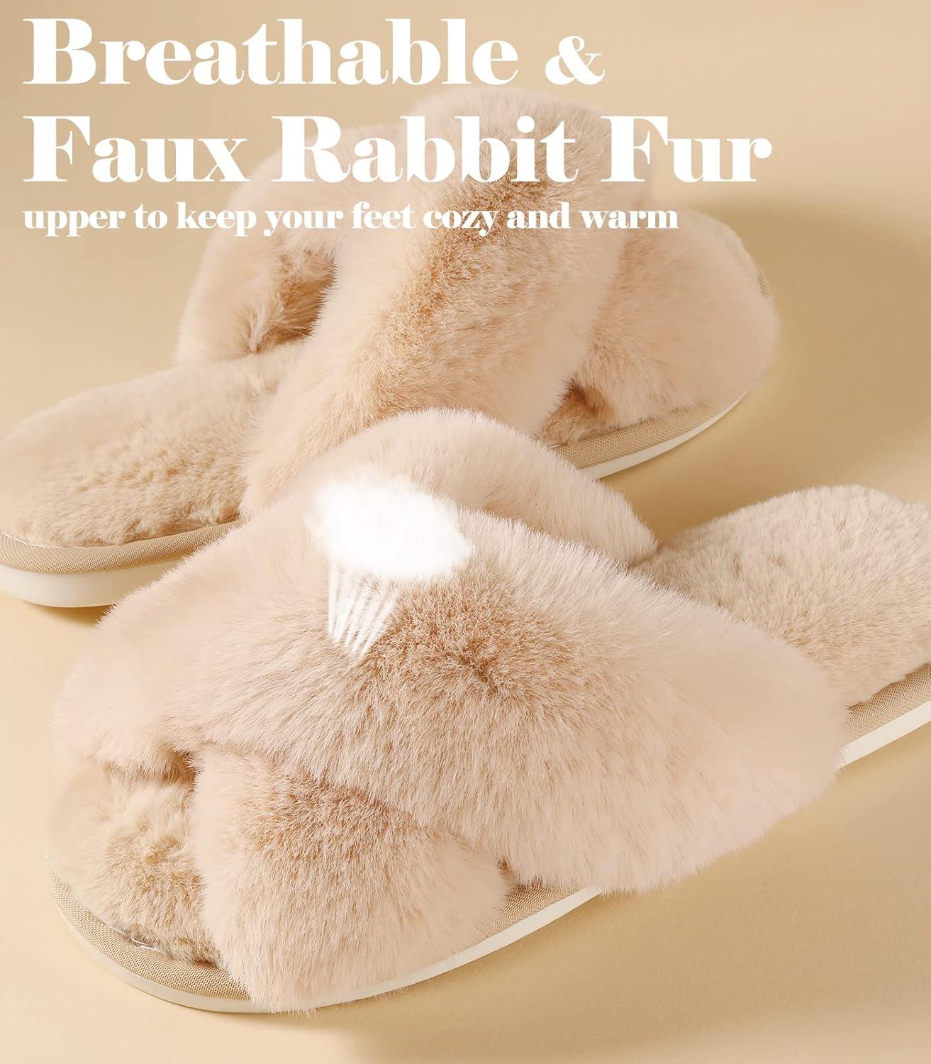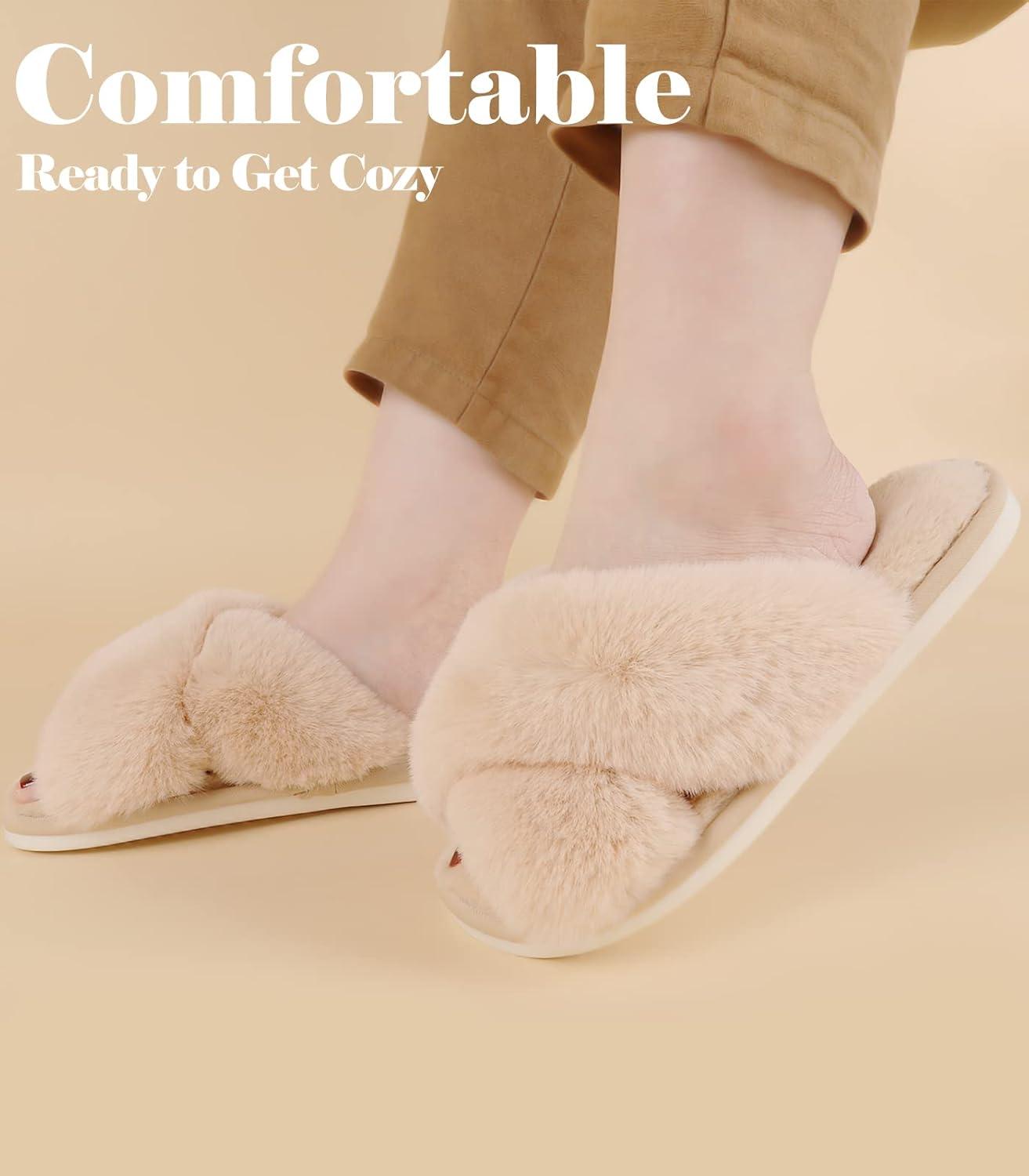 Ankis Women's Fuzzy, Cozy Soft Slippers - 2 Pairs Cross Band, Open Toe, Non-slip, Indoor/Outdoor Slippers(Camel)