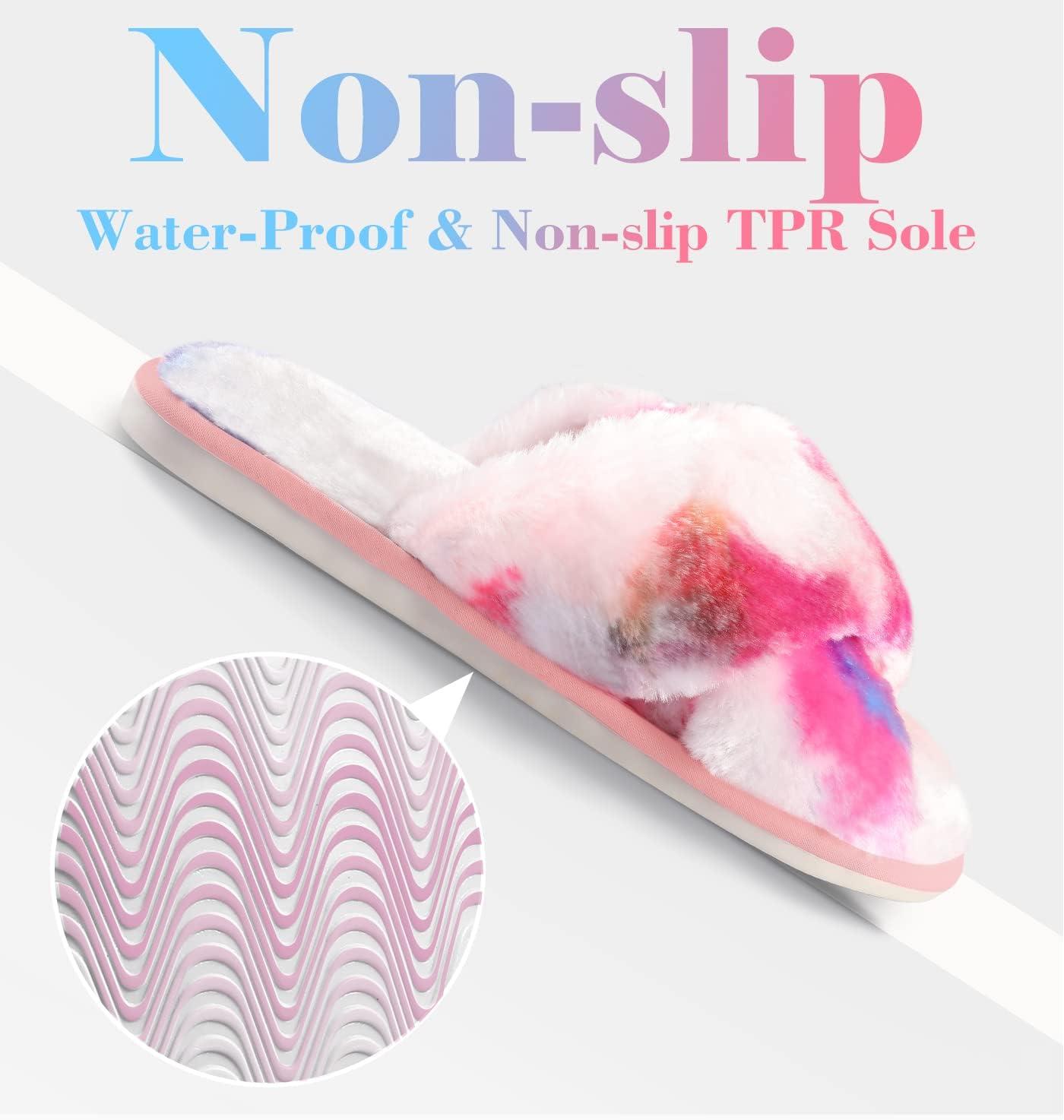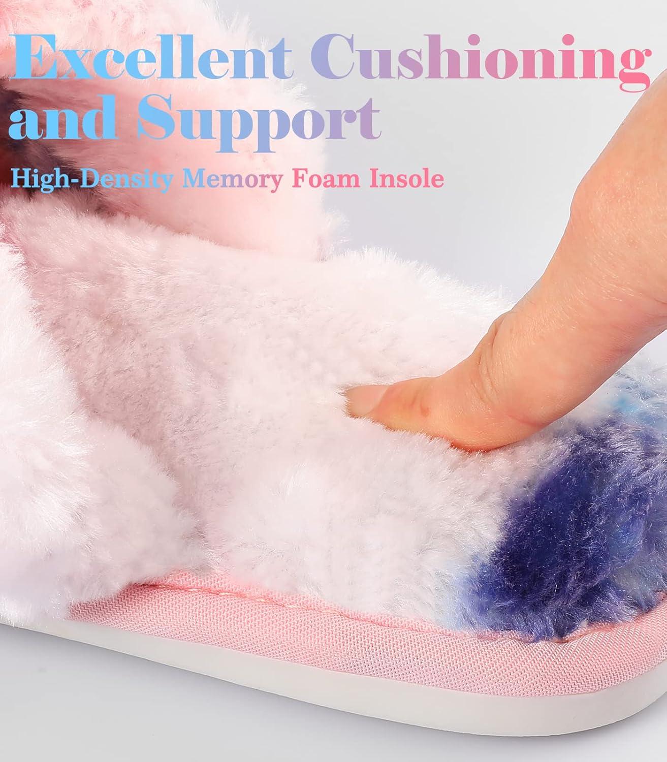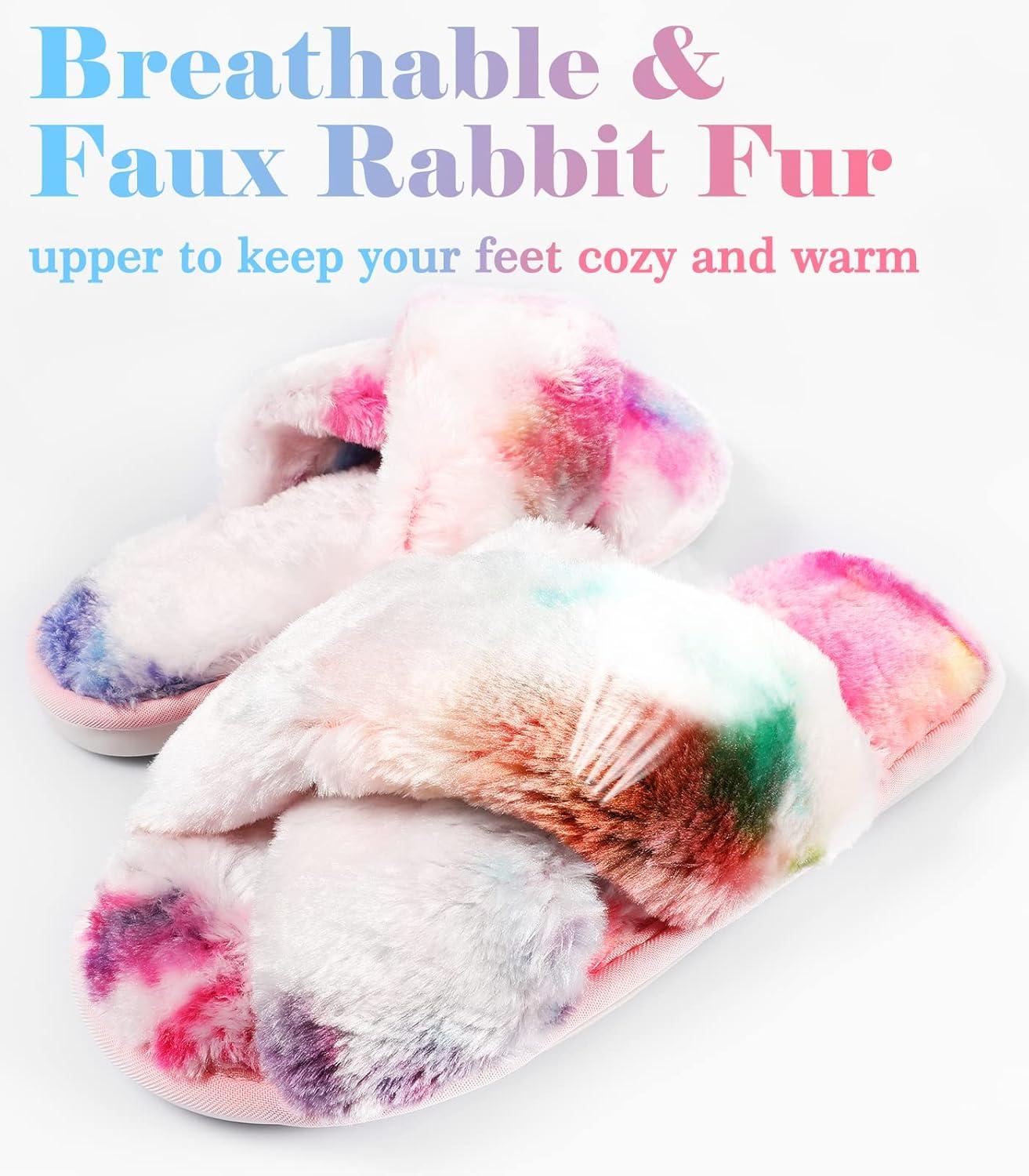 Ankis Women's Fuzzy, Cozy Soft Slippers - 2 Pairs Cross Band, Open Toe, Non-slip, Indoor/Outdoor Slippers(Rainbow)