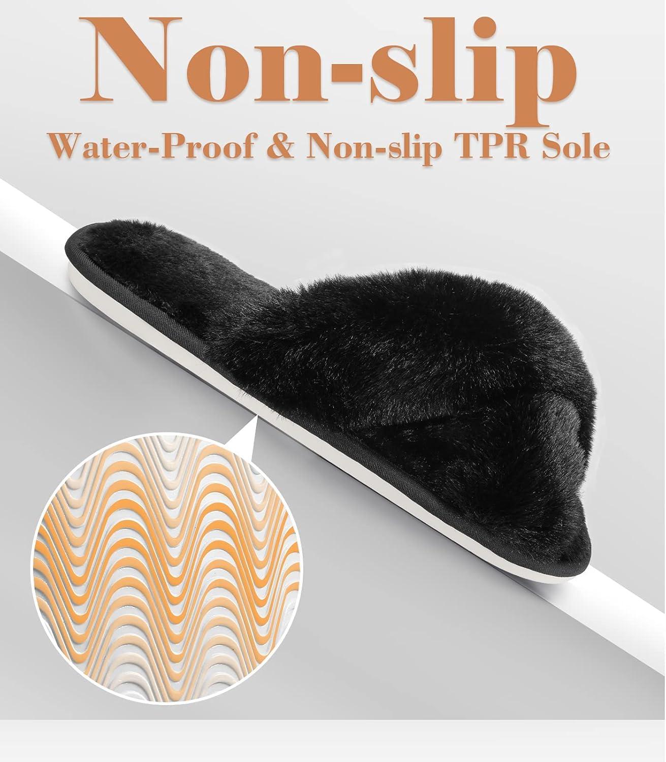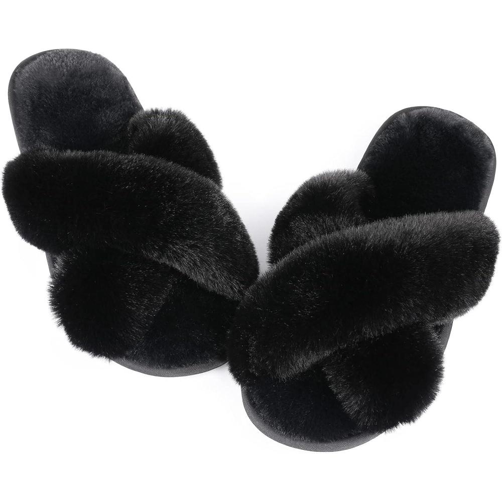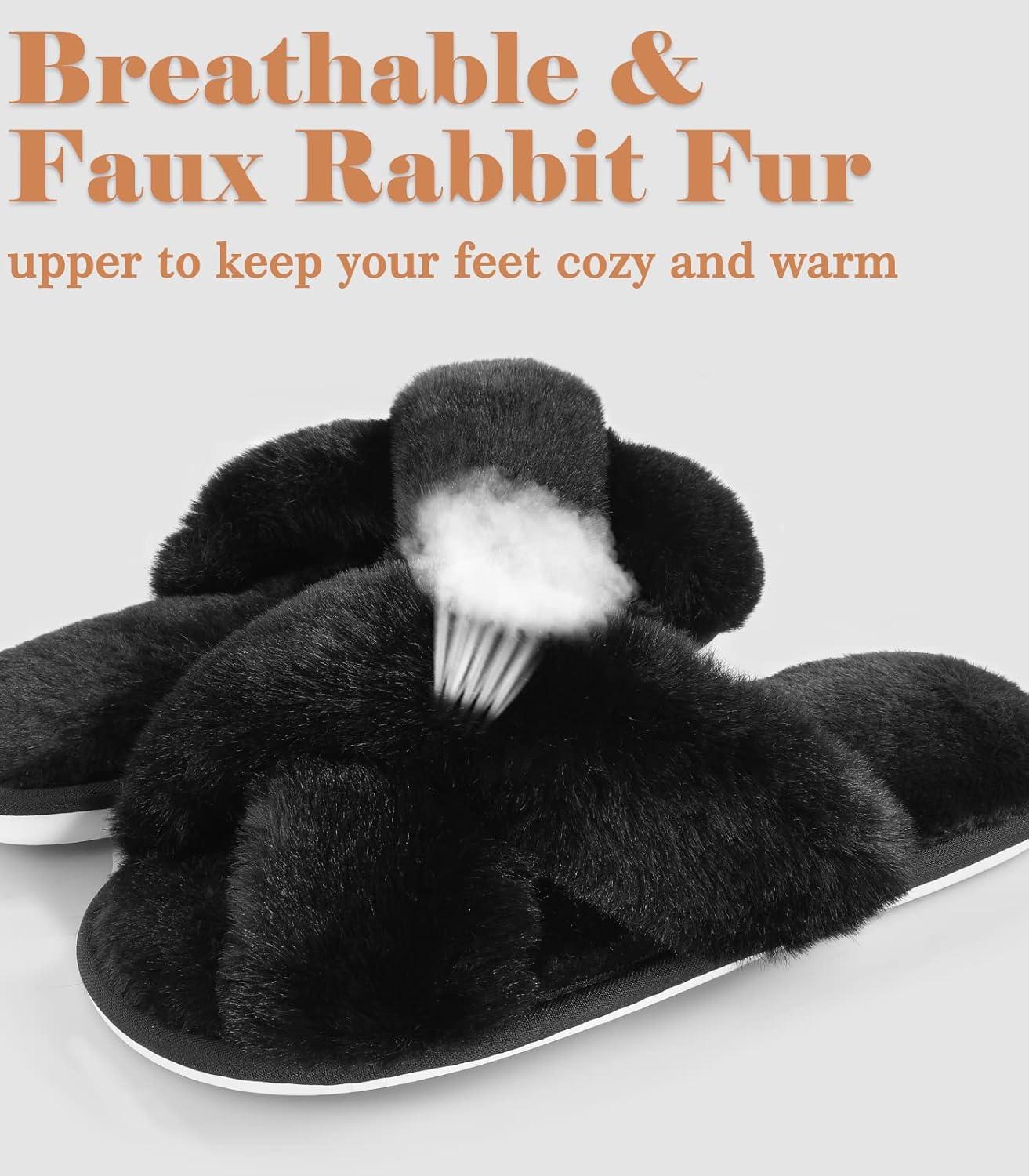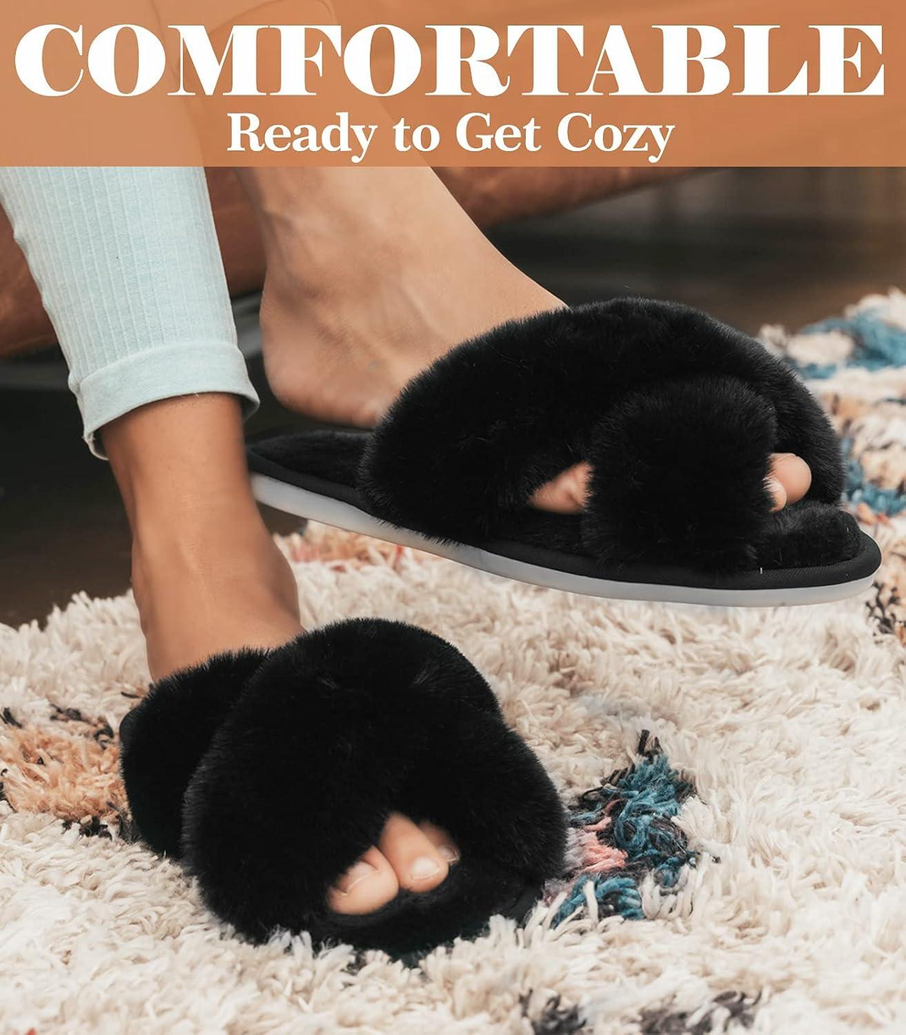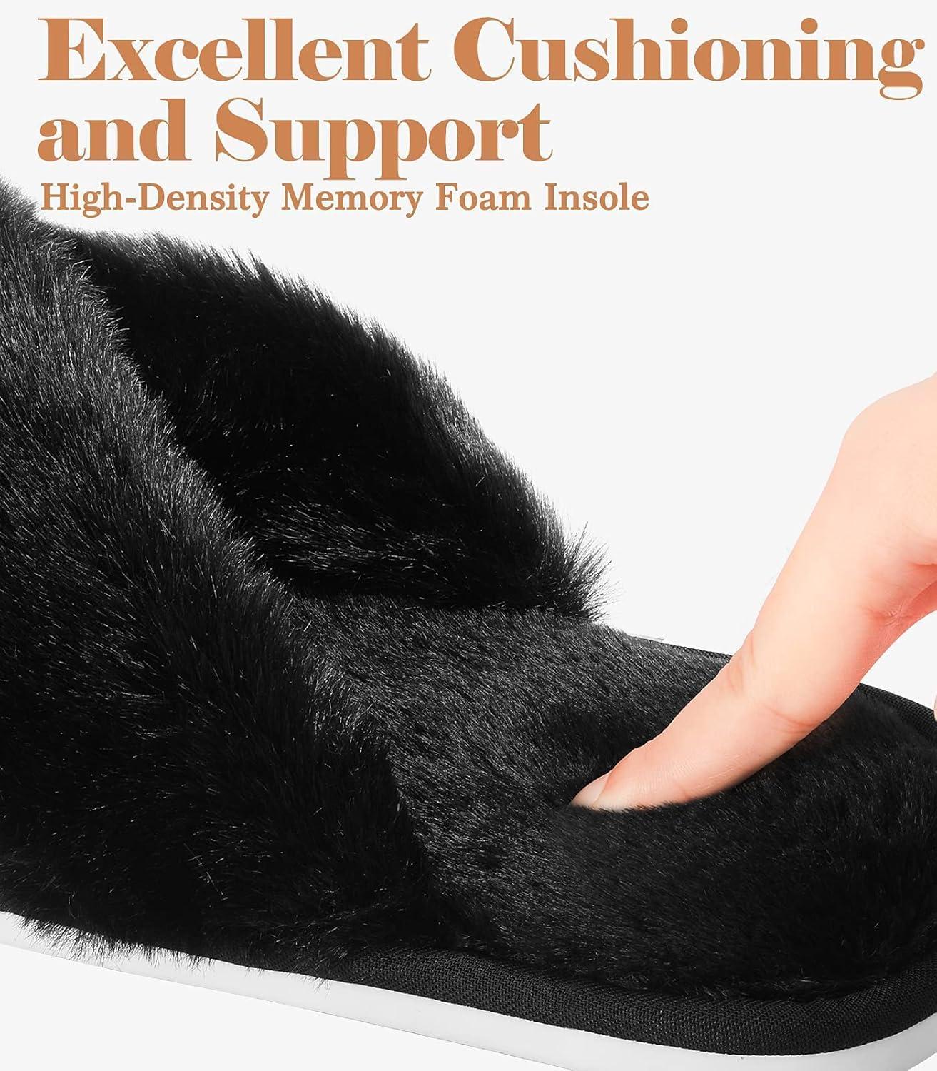 Ankis Womens Fuzzy Memory Foam Slippers Cross Band Cozy Plush Home Slippers Fluffy Furry Open Toe House Shoes Indoor Outdoor Slide Slipper(Black)