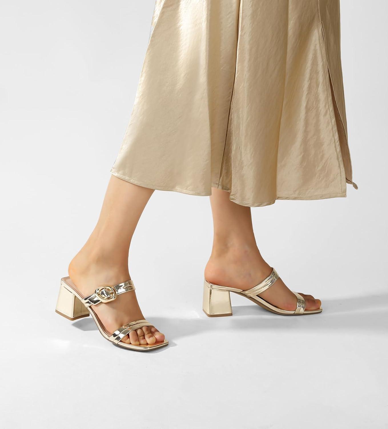 imageWomen Square Open Toe Heels Comfortable Sexy Summer Cute Back Strap Heeled Sandals Wedding Party Dress Shoes for Women Two Strap Slip On MulesMirror Gold Pu